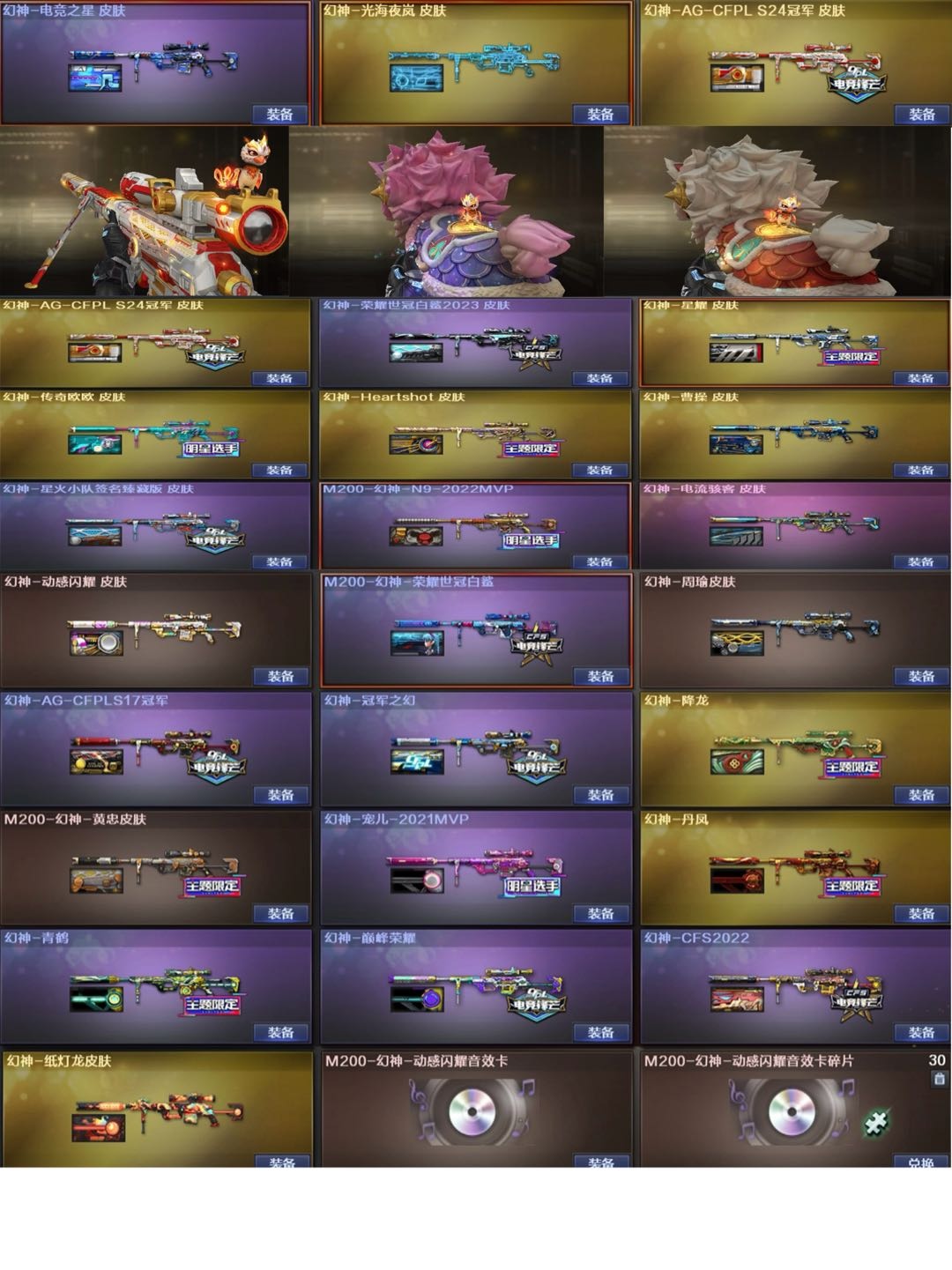 新增:荣耀世冠五件套、电竞之星六件套、套装蝴蝶刀巅峰荣耀、毁灭巅峰荣耀、满级九霄圣角、qbz拼搏皮肤、USP冥王7把、usp王者雷暴×3、玄豹套×7、荆棘角色、王者雷暴套、传说圣谕、传说星骇、幻神-光海夜阑皮肤、天戎法玛斯、白虎-白鲨S23皮肤、裁决巅峰荣耀、首发宙斯三件套、幻神AGS24皮肤、白鲨世冠2023四件套、星耀幻神、星耀毁灭、星耀屠龙、奇幻狮子M200、191银翼、金色蔷薇量子皮肤、传说幽瞳、传说幽冥、星神巅峰荣耀、冠军蝴蝶刀、传奇欧欧幻神、屠龙巅峰荣耀、USP摇滚精灵、女团系列满皮肤、白虎马枪、破浪逐光系列满皮肤、幻神曹操、夏佐炼狱皮肤、小叮当屠龙皮肤、梧桐擎天皮肤、无冕之王柯尔特、qbz2024、白虎巅峰荣耀、虎鱼QBZ皮肤、八面玲珑(生化最强步枪)VK94-金蚀、雨墨、机械姬、天罚音效卡、幻神星火小队皮肤、MK5-炽火炎龙、云龙套装×7、传说影煞、传说破晓、炼狱-泡泡象、COP-泡泡象、掌上泡泡象、极光-高能霹雳皮肤、冠军星神皮肤、冠军白虎皮肤、星神破竹皮肤、白虎虎啸皮肤、炼狱钟馗皮肤、幻神传奇N9、炼狱-枪娘擎电、王者沙漠玫瑰、G36C-幻影、幻神电流骇客皮肤、炼狱音效卡、岚希儿、纸灯笼系列皮肤(纸灯笼幻神、纸灯笼金色蔷薇、纸灯笼龙啸) 传说灵眸、王者芳薇、王者潘多拉、 M4A1小神龙、龙宝背包、龙宝头型玩偶、 生化天花板副武器 MAC龙宝、 巅峰荣耀BZ、巅峰荣耀雷神、会圆皮肤三件套(会圆毁灭、会圆火麒麟、会圆屠龙×3)、隼(生化天花板角色)、王者风神、斯太尔枪娘暗刃、星神枪娘默皮肤、虎牙平台炼狱、雾萌萌、星火燎原屠龙皮肤、宠儿QBZ皮肤、嘉年华15周年雷神皮肤、炽焰魔龙、首发白鲨世冠QBZ皮肤、白鲨世冠麒麟刺、cfs雷神十周年皮肤、白虎霓虹机甲、首发白鲨世冠、动感闪耀系列全部氪穿、神工天巧套×7、炽芒蝶刃×3、晴雅(爱心一击)、首发传说爱丽莎、白虎之魄、QBZ嘉年华柯基、USP嘉年华柯基、星神漫游皮肤、麒麟刺甜蜜糖果皮肤、QBZ天罚、女主播加语音包、毁灭直播专属皮肤、枪娘樱加语音包、枪娘阿敏QBZ皮肤、黑骑士地狱火、QBZ03-AGcfplS20冠军、白虎AG-cfpls20冠军、(星神璀璨皮肤)、裁决流光秘银皮肤、幻神降龙皮肤、关小雨、黑骑士少林皮肤、QBZ街机、(生化强化武器双面神)全国冠军QBZ、冠军柯尔特×3、knife冠军之刃×2(击杀敌方会触发嘲讽文字,拉仇恨必备)(十周年至臻珍藏皮肤)、幻神荣耀巅峰、小黄鸡、荒漠琉璃、玄武、虎牙火麒麟皮肤、幻神CFS2022皮肤、火麒麟巅峰荣耀、黑骑士2021皮肤、炼狱小钢铁、王者之霆、星神音效卡、CJB毒蜂、鹰、王者星神已觉醒、竞技荣光套装、白虎暗星、幻神丹凤青鹤宠儿(冠军系列全皮肤)