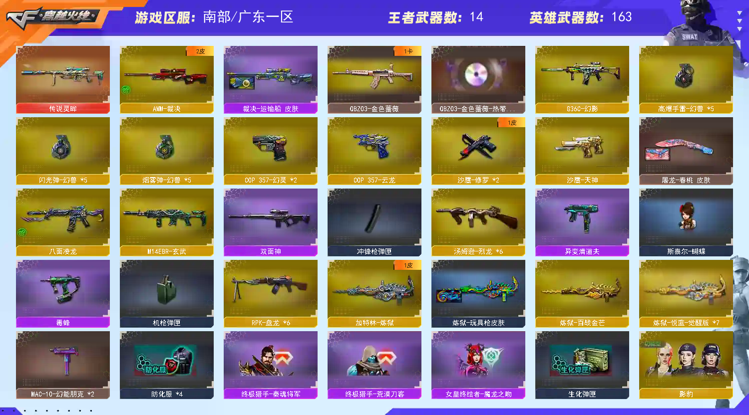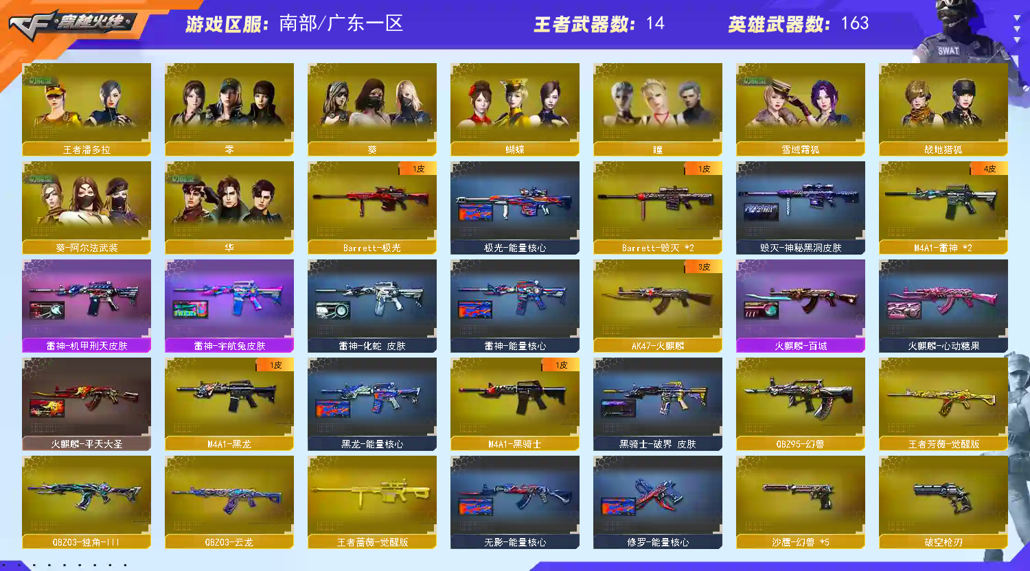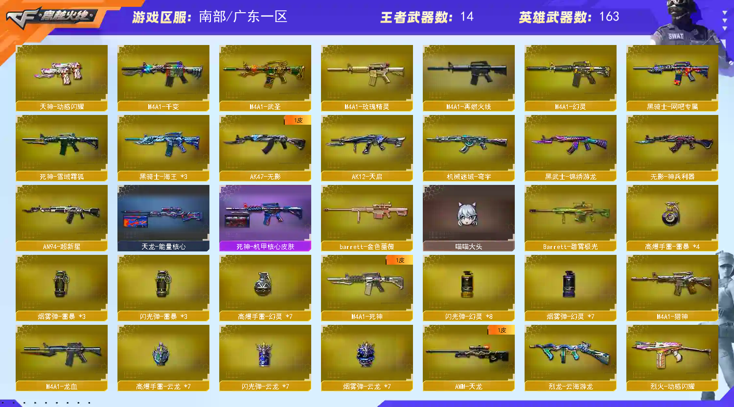 【皮肤】:雷神-机甲刑天皮肤、超新星-深海萌鲨皮肤、火麒麟-百城、死神-机甲核心皮肤、炼狱-电子连击皮肤、雷神-宇航兔皮肤、火麒麟-雷神、毁灭-百城浙江皮肤、黑龙-暗月、毁灭-神秘黑洞皮肤、炼狱-玩具枪皮肤、火麒麟-心动糖果、黑骑士-破界皮肤、火麒麟-AG战队皮肤、火麒麟-平天大圣、M4A1-千变-孔明皮肤、火麒麟-CFSTAR、修罗-CFSTAR、
