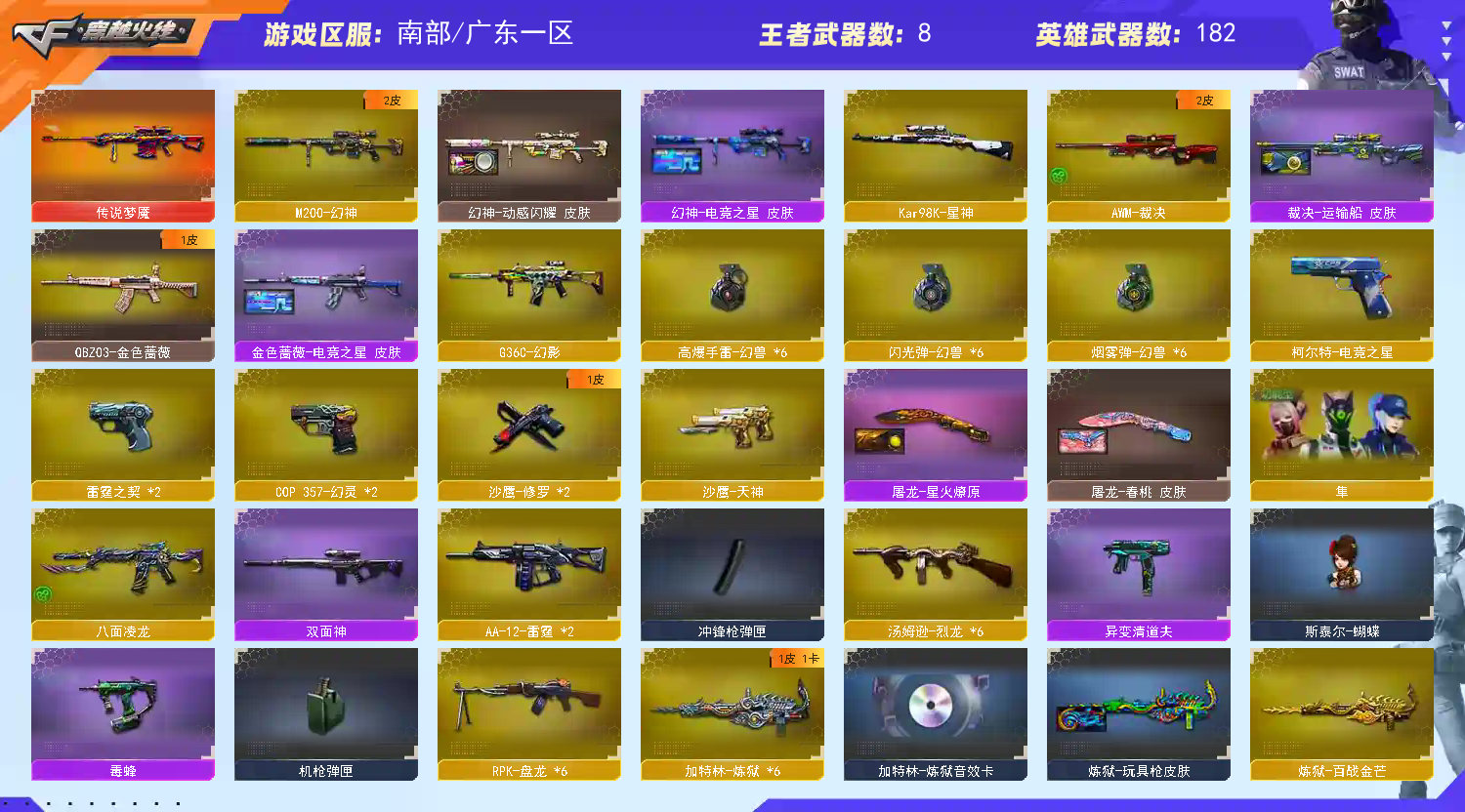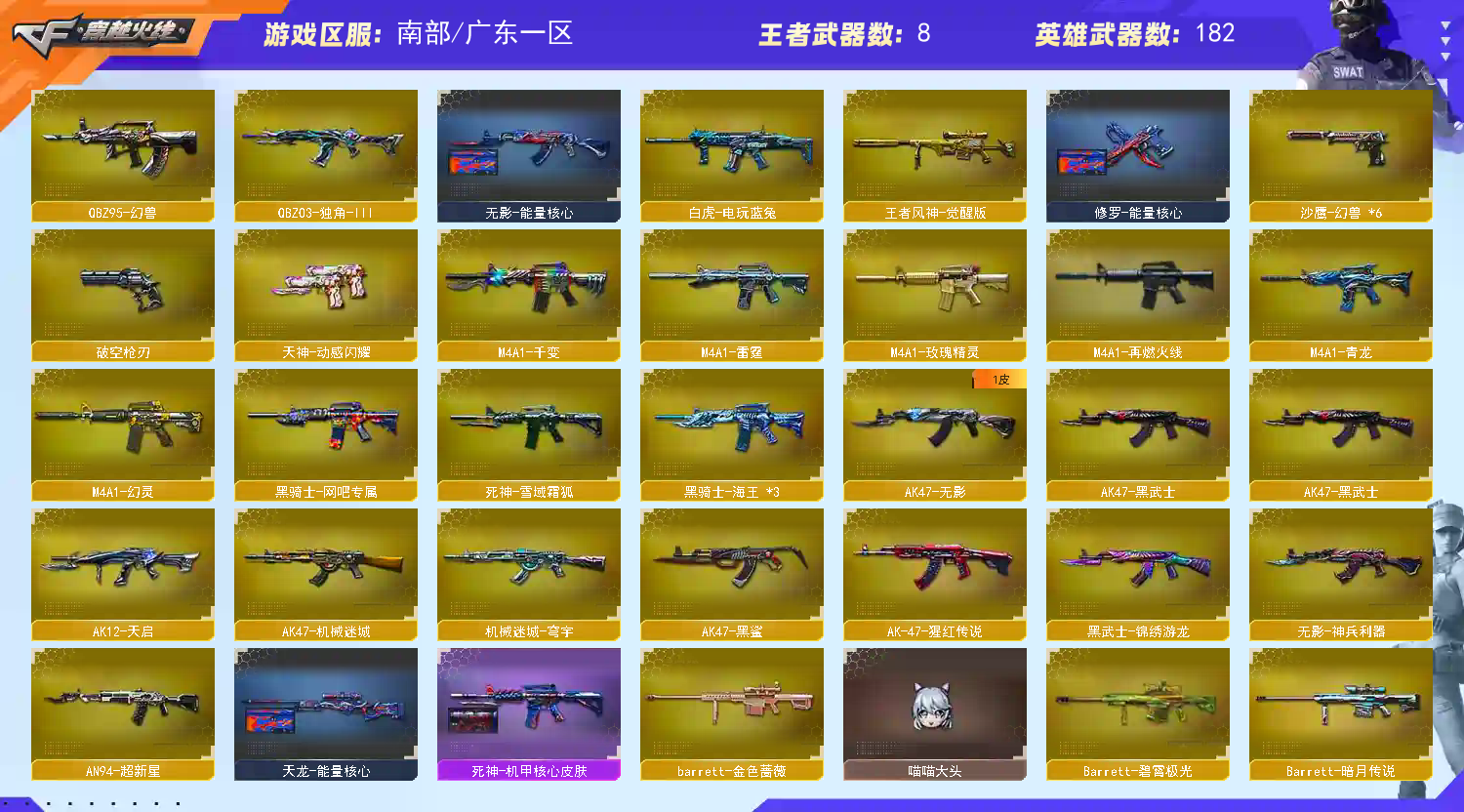 【皮肤】:火麒麟-白虎、龙啸-蛇姬皮肤、屠龙-星火燎原、雷神-机甲刑天皮肤、幻神-电竞之星皮肤、金色蔷薇-电竞之星皮肤、雷神-源计划2.0专属皮肤、火麒麟-百城、黑鲨-电流骇客皮肤、炼狱-电子连击皮肤、屠龙-惊鸿皮肤、炼狱-迷彩皮肤、雷神-宇航兔皮肤、死神-机甲核心皮肤、裁决-运输船皮肤、炼狱-玩具枪皮肤、火麒麟-心动糖果、毁灭-神秘黑洞皮肤、火麒麟-雷神、黑龙-暗月、毁灭-虹光风暴皮肤、毁灭-百城浙江皮肤、黑骑士-破界皮肤、Barrett-金色蔷薇-蛇姬皮肤、雷神-化蛇皮肤、战神-紫绶金章皮肤、毁灭-英雄计划皮肤、屠龙-春桃皮肤、火麒麟-AG战队皮肤、火麒麟-平天大圣、龙啸-青青莓果皮肤、裁决-胜者为王、M4A1-千变-孔明皮肤、幻神-动感闪耀皮肤、火麒麟-CFSTAR、天龙-CFSTAR、修罗-CFSTAR、