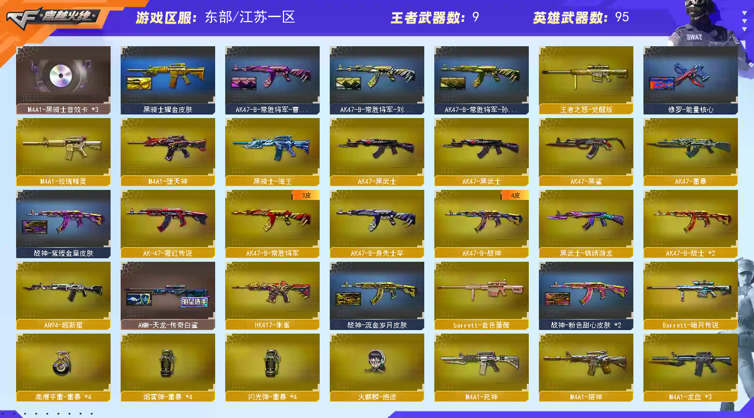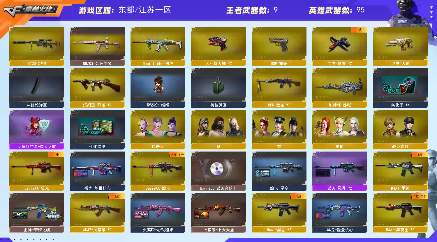 【主 武】:M200幻神、HK417朱雀、ScLi白虎、AK47雷暴、M4A1堕天神、烈龙X7、斯泰尔蝴蝶、盘龙X3、加特林炼狱、王者之影、王者之戮、王者之光(觉醒)、王者之怒(觉醒)、炫金超新星、炫金天龙X2、火麒麟(雷神、AG战队、CFSTAR、平天大圣)、黑龙X2(能量核心、暗月)、雷神(荣耀之魄)、黑骑士X2(音效卡、白马银枪、耀金)、死神、黑武士、超新星、黑鲨、龙血X3、玫瑰精灵、QBZ03金色蔷薇、猎神、烈火、AK47-猩红传说(老兵传说皮肤)、AK47-B-战士X2、AK47-B-战神(粉色甜心皮肤、流金岁月皮肤、紫媛金章皮肤)、黑骑士海王、AK17-B-身先士卒、AK47-B-常胜将军(常胜将军孙权、常胜将军刘备、常胜将军曹操)、天龙(传奇70KG、传奇白鲨)、毁灭(音效卡、星空)、极光(能量核心)、金色蔷薇、暗月传说、火麒麟绝迹、AK47冰龙粉碎者、极光毁灭者、KAC圣炎切割者、巨龙咆哮、黑龙吞噬者、神圣爆裂者末日、巴雷特水下丽影、C.A.T、金色小号、M37葵
