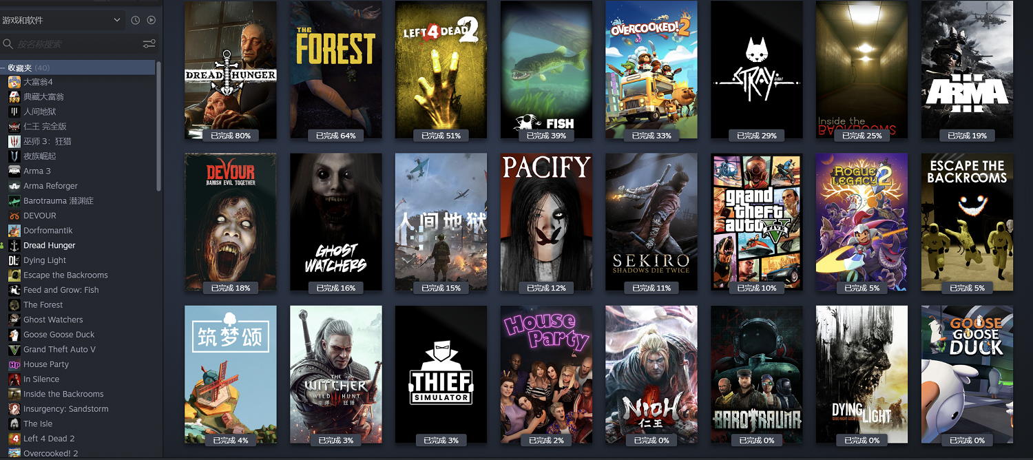 骗子酒吧、黑神话悟空、收获日payday2、恐惧饥饿(Dread Hunger)、只狼影逝二度(Sekiro: Shadows Die Twice )、瘟疫传说安魂曲(A Plague Tale: Requiem)、侠盗猎车手5(Grand Theft Auto V)、人间地狱(hell let loose)、武装突袭4/武装突袭Reforger(Arma Reforger)、叛乱沙漠风暴(Insurgency: Sandstorm)、迷失/流浪猫(Stray)、深入后室/后室攻略(Inside The Backrooms )、逃离后室(Escape the Backrooms)、吞噬(DEVOUR)、安抚(Pacify)、幽灵观察者(Ghost Watchers )、寂静(In Silence)、武装突袭三豪华版 (Arma 3 Ultimate Edition)、求生之路2、海底大猎杀、潜渊症(Barotrauma)、仁王完全版、巫师3狂猎完全版、迷失森林 The forest、恐龙岛/岛屿(the isle)、幽灵恐怖/恐鬼症、夜族崛起(V Rising)、小偷模拟器、盗贼遗产2(Rogue Legacy 2)、贪婪的魔鬼(Ravenous Devils)、筑梦颂(Dorfromantik )、狙击精英4豪华版(Sniper Elite 4 Deluxe Edition)、消逝的光芒(Dying Light)、民主制度4(Democracy 4)、分手厨房2/胡闹厨房2/烹糊了2(Overcooked! 2)、家庭派对(House Party)、幻舞之刃(Furi)、文明6(Sid Meier's Civilization VI)、大富翁4、典藏大富翁、大鹅模拟器/无名之鹅/捣蛋鹅(Untitled Goose Game)、鹅鸭杀
