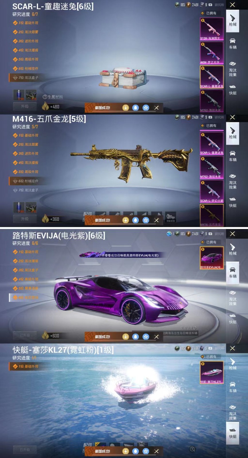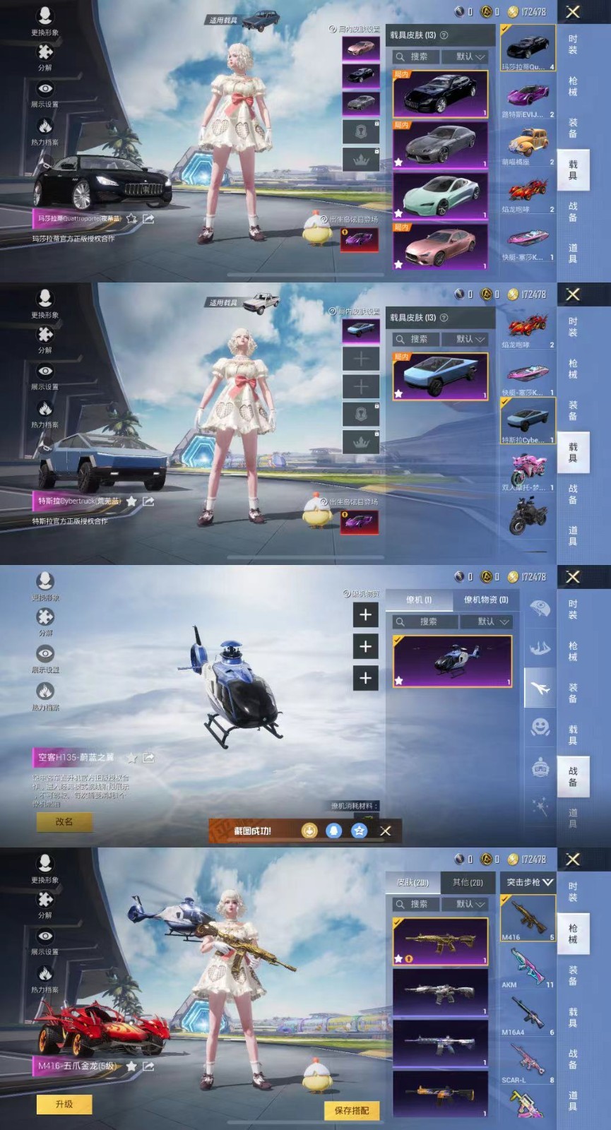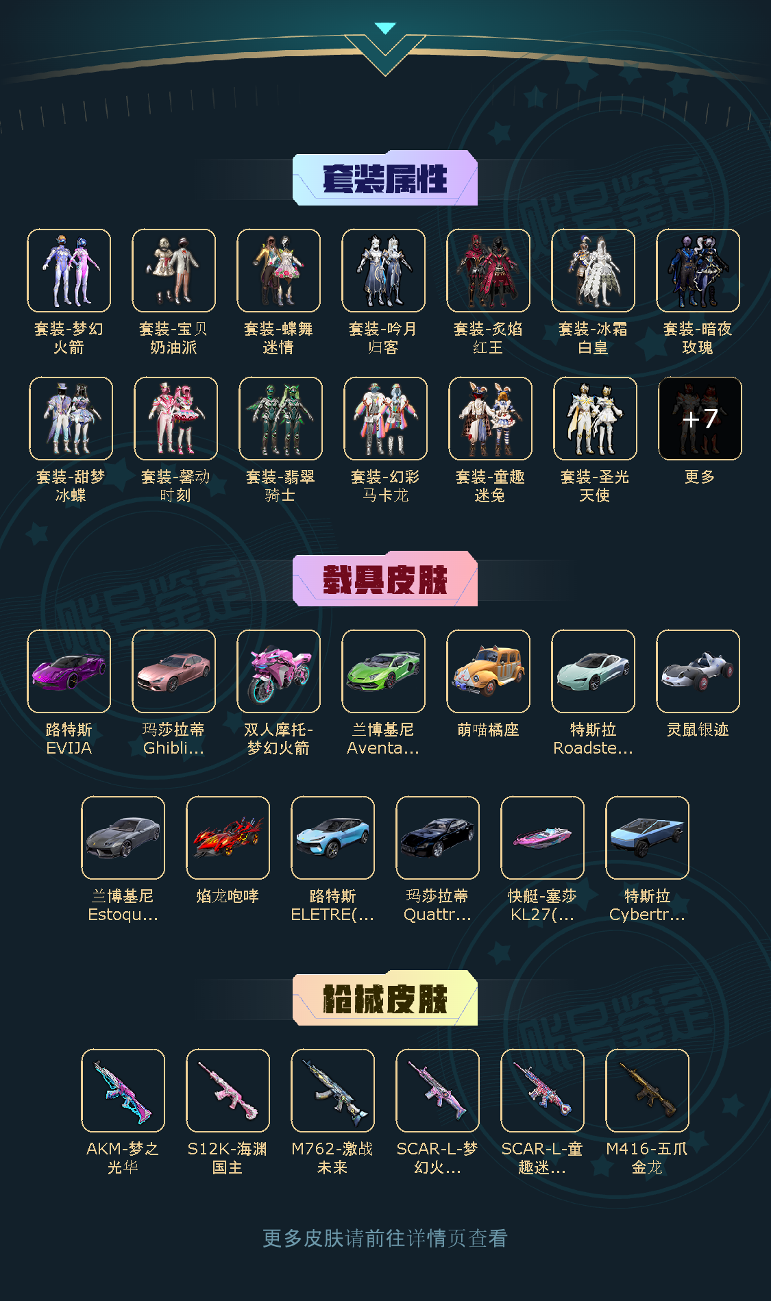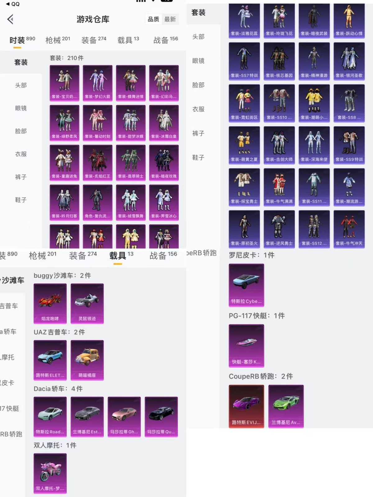 17粉14载具6特效 粉装:宝贝奶油派/灵感创作师/垂柳戏鸭/绒雪飘舞/霁雪冰心/复仇流浪者/吟月归客/甜梦冰蝶/绿野柔风/馨动时刻/童趣迷兔/冰霜白皇/炙焰红王/翡翠骑士/幻彩马卡龙/梦幻火箭/蝶舞迷情/军刀雅典娜/浪漫波比/暗夜玫瑰/ 特效枪:海渊国主(3级)梦之光华(5级)童趣迷兔(5级)激战未来(3级)梦幻火箭(3级)五爪金龙(5级)载具:5级路特斯(电光紫)绿兰博基尼 玛莎(夜幕蓝)灰兰博基尼 特斯拉(水滴蓝) 粉玛莎 萌喵橘座 路特斯(冰川蓝)焰龙咆哮 灵鼠银迹 快艇(粉)特斯拉(荒芜蓝) 梦幻火箭摩托 蓝飞机 套装:210 枪皮:201【6.2设备】
