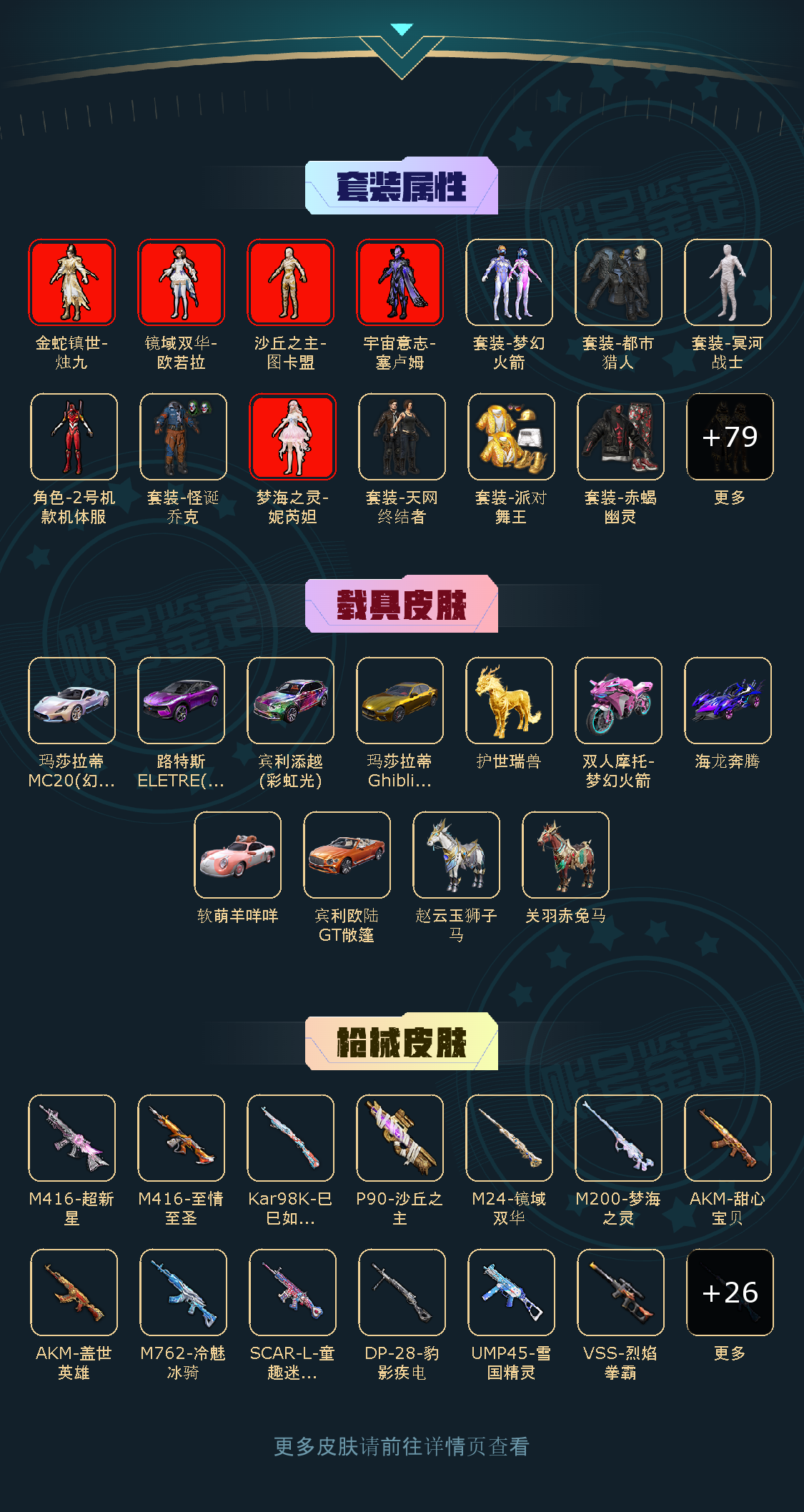 354套装,DP-28-暗夜鎏金/AKM-盖世英雄/AKM-甜心宝贝/SCAR-L-童趣迷兔/SKS-碧影闪光/AUG-星之彼岸/M249-彩虹甜喵/AWM-花间之火/M762-甜心娃娃/MG3-炙焰牛王/GROZA-香水柠檬/AWM-橘柚倾心/M416-心之恋语/平底锅-林间仙鹿/M416-五爪金龙/M16A4-垂柳戏鸭/AKM-炫紫旋律/MG3-洛神天依/GROZA-焦糖拿铁/M762-冷魅冰骑/UZI-筑梦精灵/M416-至情至圣/SLR-暗夜玫瑰/S12K-海渊国主/VSS-烈焰拳霸/AUG-妙趣可丽/UMP45-雪国精灵/M762-甜蜜誓约/MK20-H-海螺星光/UMP45-恐龙拽拽/AKM-梦之光华/路特斯EVIJA(星际黄)/玛莎拉蒂Ghibli(金)/海龙奔腾/双人摩托-梦幻火箭/玛莎拉蒂MC20(幻星粉)/快艇-塞莎KL27(霓虹粉)/路特斯ELETRE(电光紫)/极速兔兔/软萌羊咩咩/