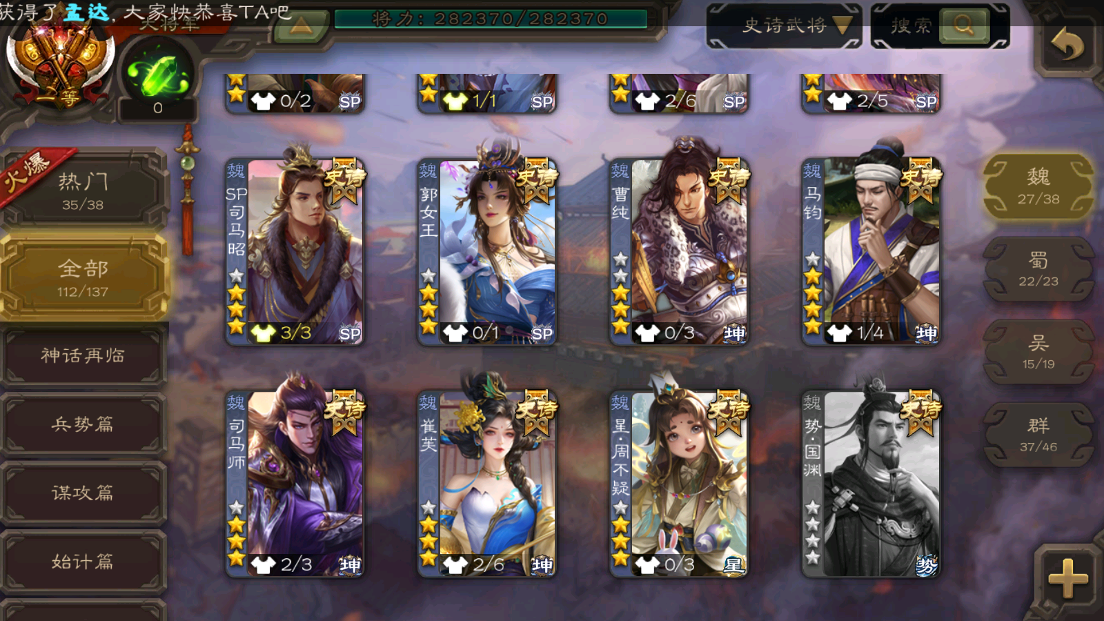 【全平台】 崔芙【有卡】有手气卡无换将卡112史诗神司马懿动刘焉谋关羽回廊文鸯回廊神郭嘉回廊神荀彧十常侍