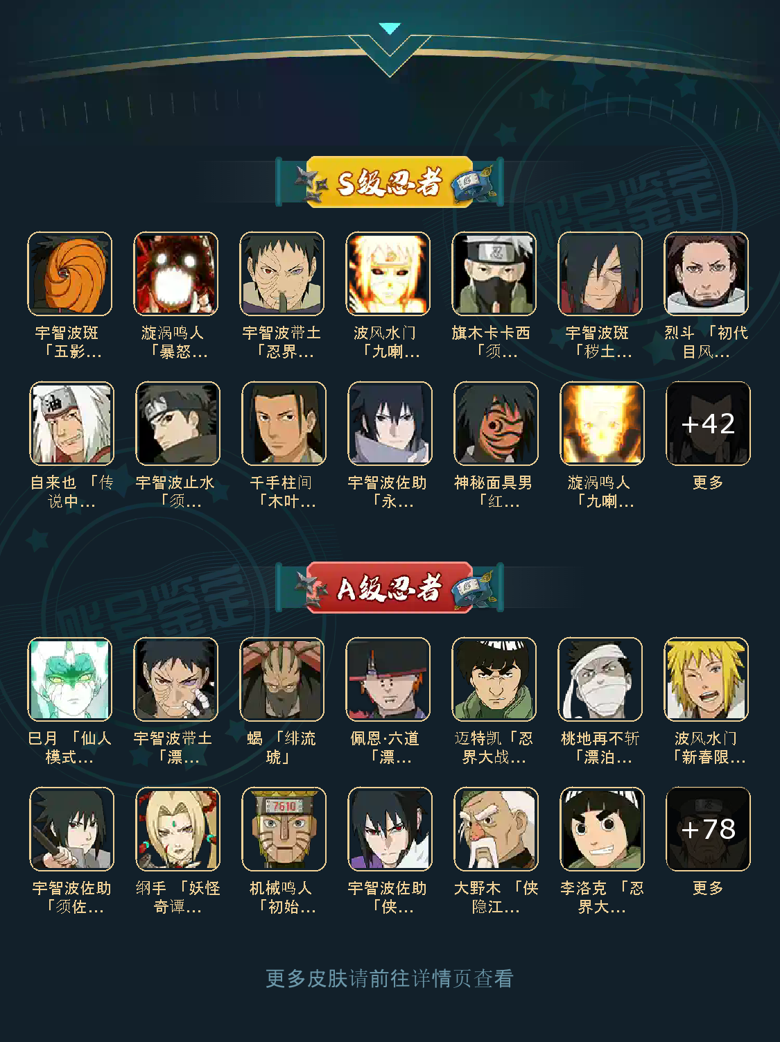 仙人自来也 纲手 波风水门 百战水门 猿飞日斩 千手柱间 宇智波斑 宇智波鼬 舞之自来也 大蛇丸 百战大蛇 秽土四代 秽土三代 秽土长门 仙人兜 黄猿九喇嘛鸣人 紫狗永恒佐助 樱婊忍战樱 秽土鼬 普通自来也 百豪纲手 死门凯 二代扉间 秽土二代 秽土初代 秽土柱间 白面具 须佐卡卡西 小胡子鬼灯幻月 雷影 土影 无 佩恩 百战佩恩 青年柱间 创立初代 秽土斑 青年斑 解斑 须佐止水 虎皮 破面带土 红夜带土 罗砂 秽土三代风影 忍战雷影 三代雷影 金角银角 秽土半藏 忍战大野木 小土豆 天道超 大筒木桃式 大筒木金式 钢铁之躯凯 桀骜之刃阿斯玛 狂野之鲨鬼鲛 飞段 黑飞段 百豪樱 忍战李 大卡卡西 五代水影照美冥 宇智波鼬 仙鸣 九尾查克拉鸣人 鹰佐 奇拉比 青年艾 半蛇兜 晓蛇 新春鼬 面麻 须佐佐助 疾风咒印佐助 忍战宁次 忍战天天 最终章雏田 幻容卡卡西 神卡 忍战卡卡西 泳装卡卡西 忍战凯 青春哥 惊门凯 爱情哥 新春止水 新春水门 青年水门 青水 新春我爱罗 泳装照美冥 侠隐照美冥 侠隐纲手 侠隐兜 漂泊再不斩 漂泊佩恩 漂泊二代 漂泊小南 漂泊佩恩 三船 青年三船 青年长门 泳装南 新春南 黑绝 新春大蛇丸 晓创生角度 晓创生蝎 晓创生飞段 泳装鼬 鲛肌融合鬼鲛 新春迪达拉 秽土迪达拉 恶灵之影飞段 暴怒带土 忍战黄土 卑留呼 桃博 黑土