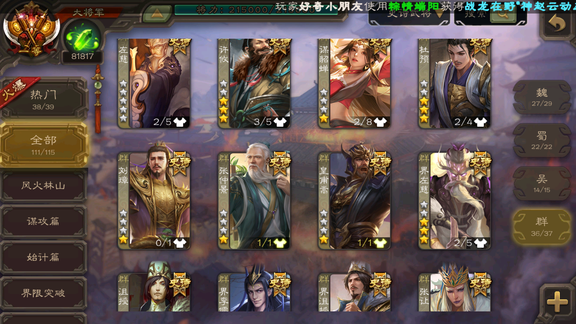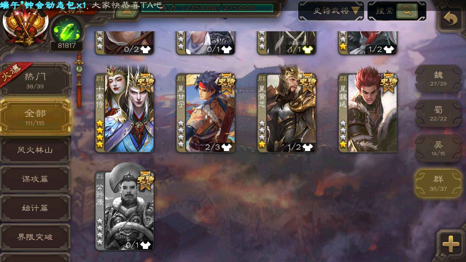 【全平台】 【珍藏全扩全武将123史诗】v24动势辛宪英势陆郁生友诸葛司马昭曹髦双形态文鸯回廊美羊羊回廊神郭