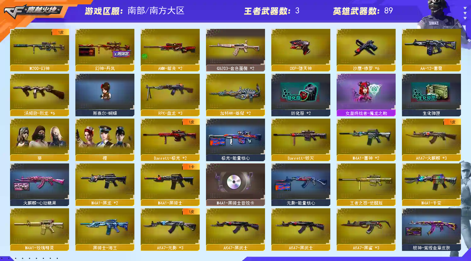 【主 武】:M200幻神(丹凤)、6烈龙斯泰尔蝴蝶、3盘2炼狱、炫金雷神、炫金毁灭、王者之戮、王者之怒、火麒麟X4、黑龙X3、雷神X2、无影X3、黑骑士、黑武士、黑鲨X3、无影神兵利器、玫瑰精灵、金色蔷薇X2、烈火X4、猩红传说、战士、战神、海王、天龙、毁灭、极光X2、裁决X2、暗月传说、AA12雷霆、毁灭征服者、冰龙粉碎者、机甲撕裂者、激光毁灭者、圣炎切割者、深渊巨龙咆哮、神圣爆裂者、试炼破坏者、苍雷、金魔等各种活动武器