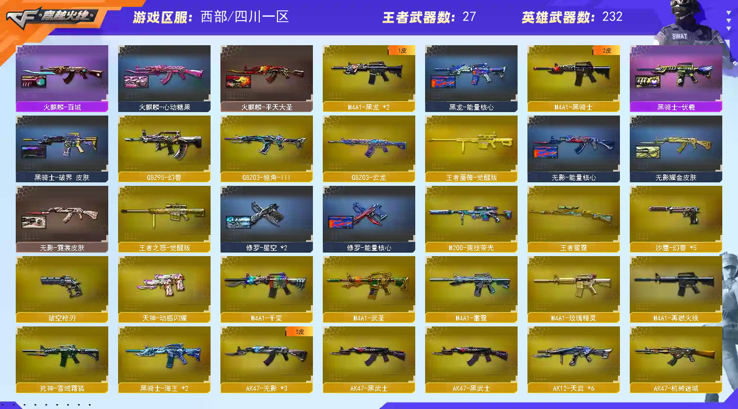 【皮肤】:毁灭-百城浙江皮肤、无影耀金皮肤、雷神-维纳斯皮肤、炼狱-月皮肤、麒麟刺-萌杀皮肤、雷神-机甲刑天皮肤、黑骑士-伏羲、屠龙-星火燎原皮肤、火麒麟-盘古、火麒麟-百城、死神-秘银、天龙-秘银、雷神-暗月、黑龙-暗月*2、火麒麟-雷神、火麒麟-心动糖果、M4A1-千变-孔明皮肤、无影-霓裳皮肤、火麒麟-平天大圣、火麒麟AG战队皮肤、