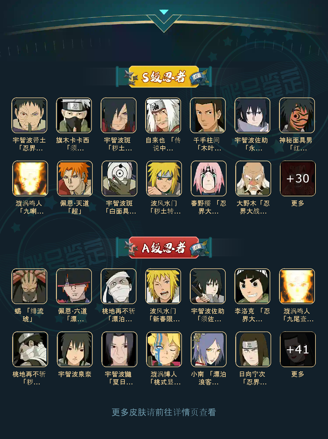 A级忍者(45个):宁智波,飞段「死司凭血」,为都,飞段,我爱罗「疾风传」,飞阿斯玛「秽土转生」,波风水门「新春限定」,迪达拉,蝎,迈特凯,猛飞阿斯玛,干杮鬼鲛,宇智波止水,小南,旗木卡卡西「万花筒写轮眼」,角都「地怨鹰」,漩涡鸣人「仙人模式」,奇拉比,宁智波佐助「万花简写轮眼!,达鲁伊,照美冥「五代日水影1,春野樱「白豪!,大蛇丸「晓I秋道丁次1忍界大战」,小南「夏日泳装」,我爱罗「忍界大战」,药帅兜「半蛇斗」,千代「近松十人卫」,漩涡鸣人「九尾查克拉」,獴飞木叶丸「博人传」