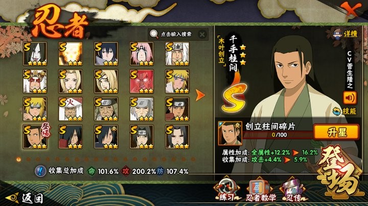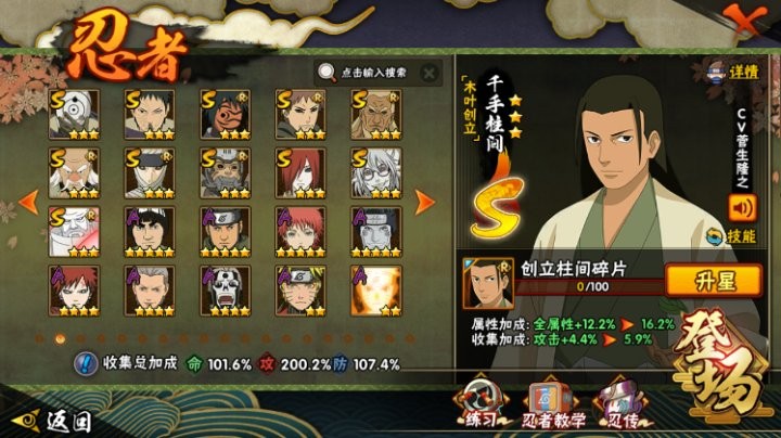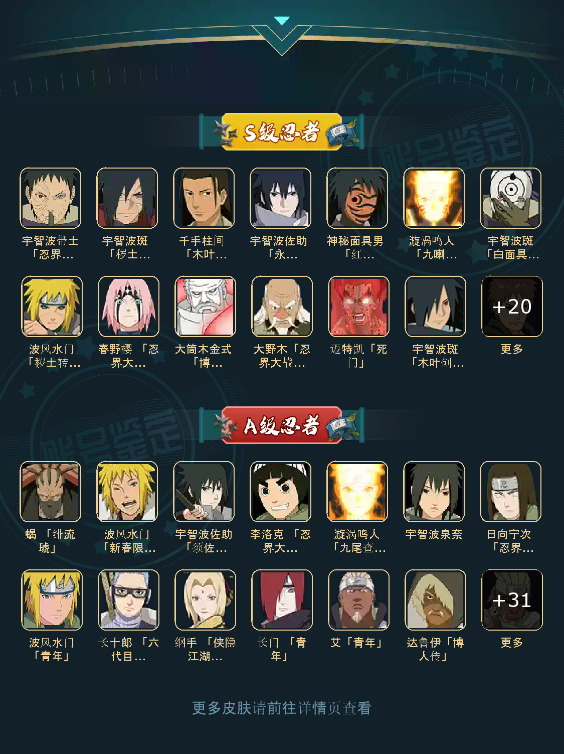 S忍31个;A忍40个,通灵兽20个,S忍:大蛇丸九喇嘛鸣人永恒万花筒佐助忍战樱普通自来也百豪纲手普通纲手死门凯波风水门豪杰自来也秽土水门猿飞日斩秽土猿飞秽土扉间千手柱间木叶创立柱间秽土斑木叶创立斑须佐鼬秽土鼬白面具忍战...