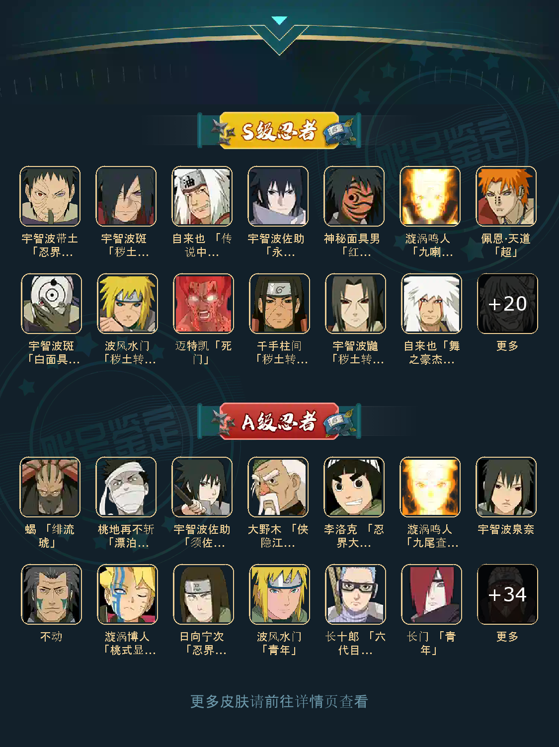 VIP9级;S忍31个;A忍40个,通灵兽22个,S忍:普通纲手大蛇丸波风水门猿飞日斩九喇嘛鸣人永恒万花筒佐助忍战樱百豪纲手普通自来也豪杰自来也死门凯秽土水门秽土猿飞千手扉间秽土扉间千手柱间秽土柱间木叶创立柱间宇智波斑秽.