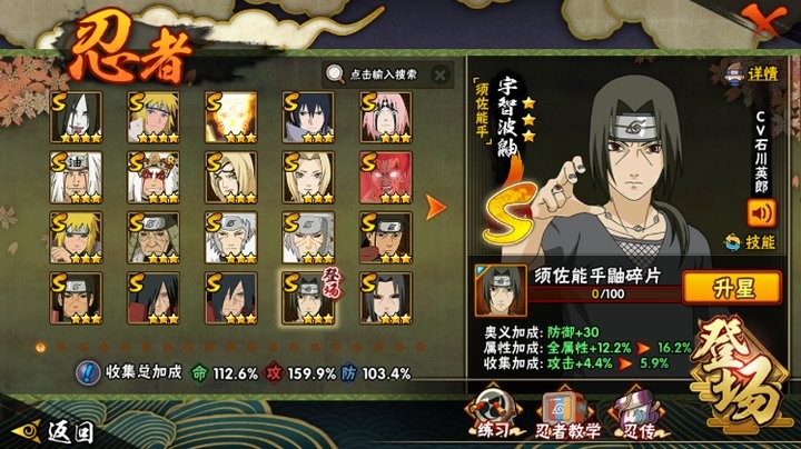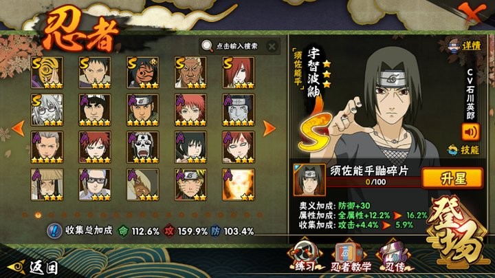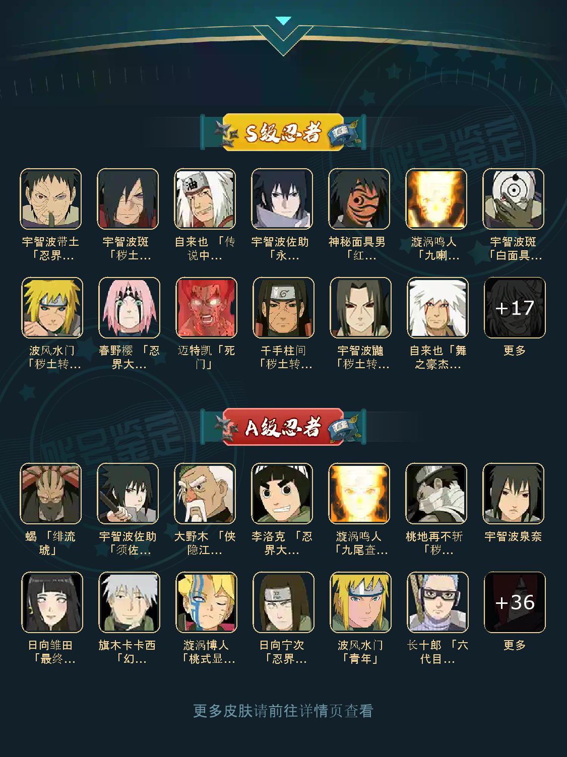 VIP8级;S忍26个;A忍42个,通灵兽21个,S忍:大蛇丸波风水门九喇嘛鸣人永恒万花筒佐助忍战樱百豪纲手普通纲手死门凯普通自来也豪杰自来也秽土水门秽土猿飞千手扉间秽土扉间千手柱间秽土柱间秽土斑秽土解斑须佐鼬秽土鼬神秘