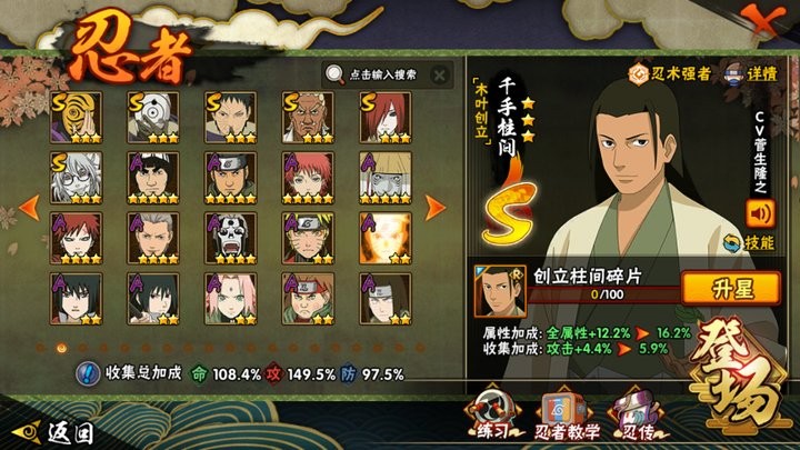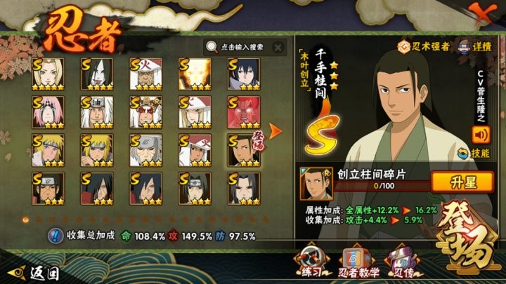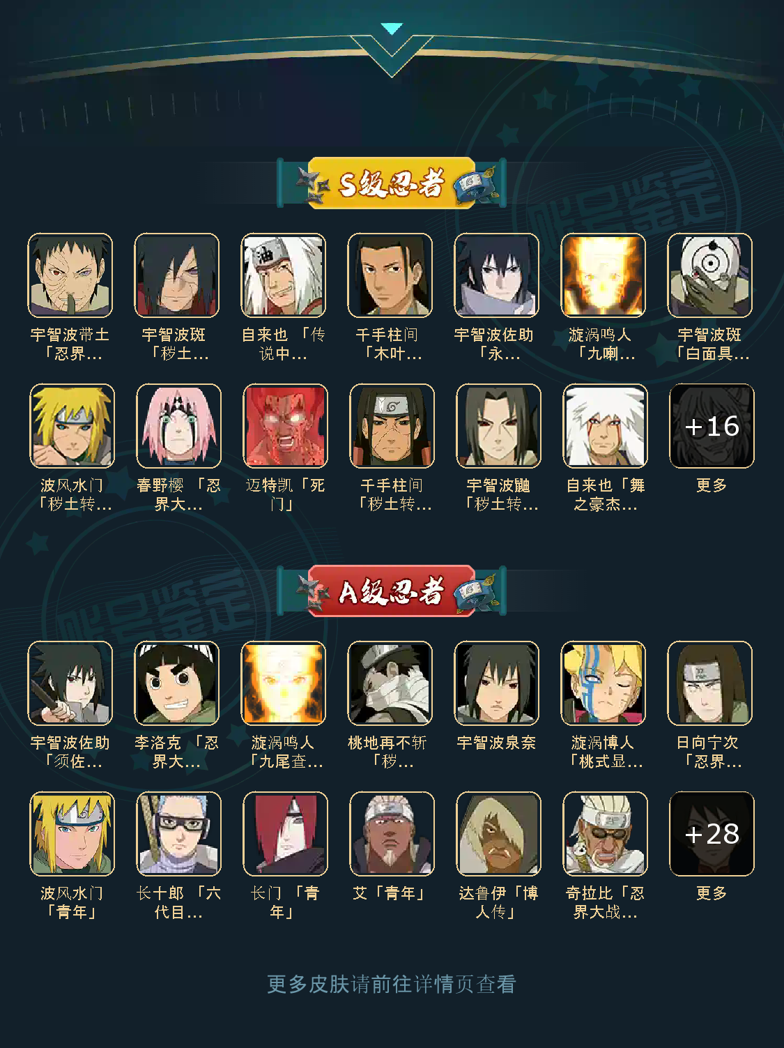 ;VIP9级;S忍26个;A忍34个,通灵兽21个,S忍:普通纲手大蛇丸猿飞日斩九喇嘛鸣人永恒万花筒佐助忍战樱百豪纲手死门凯普通自来也豪杰自来也波风水门秽土水门秽土扉间千手柱间木叶创立柱间秽土柱间秽土斑秽土解斑须佐鼬秽土鼬..
