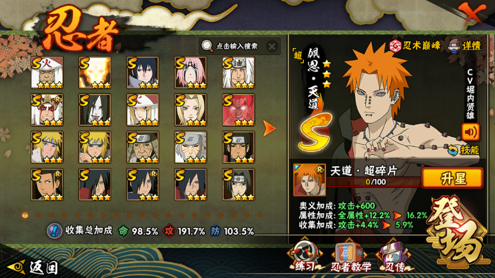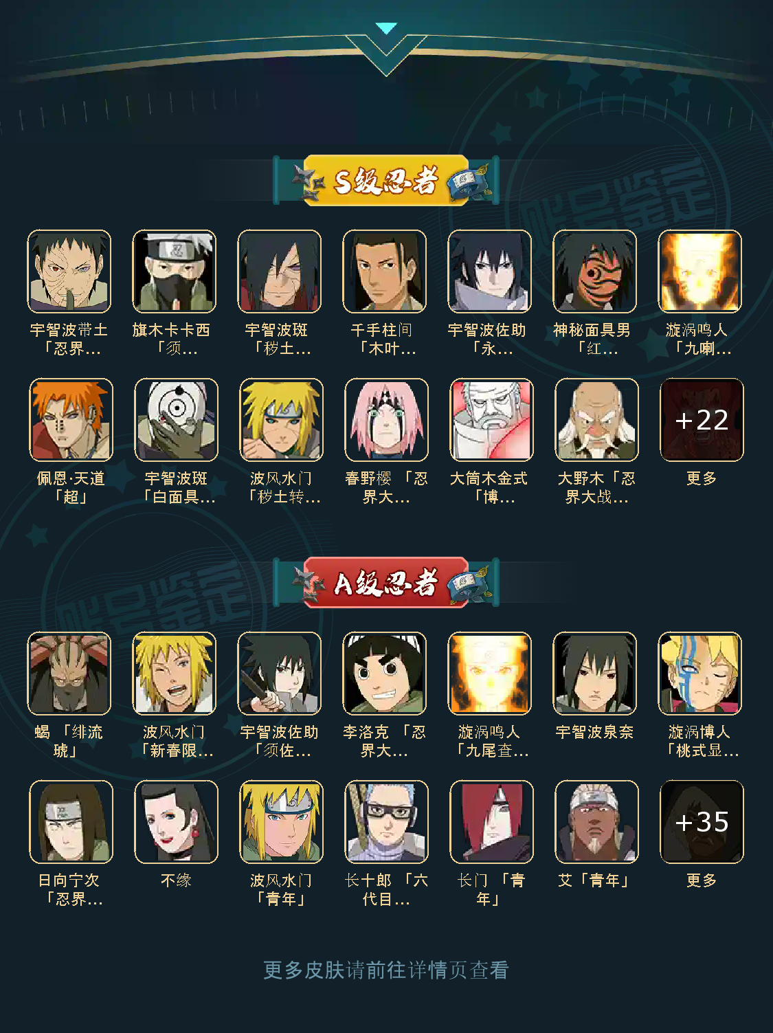 战力:1183W+;VIP12级;S忍32个;A忍41个,通灵兽21个,S忍:猿飞日斩九喇嘛鸣人永恒万花筒佐助忍战樱普通自来也大蛇丸百豪纲手普通纲手死门凯豪杰自来也波风水门秽土水门秽土猿飞秽土扉间木叶创立柱间秽土柱间秽土斑木叶创立斑秽土解斑