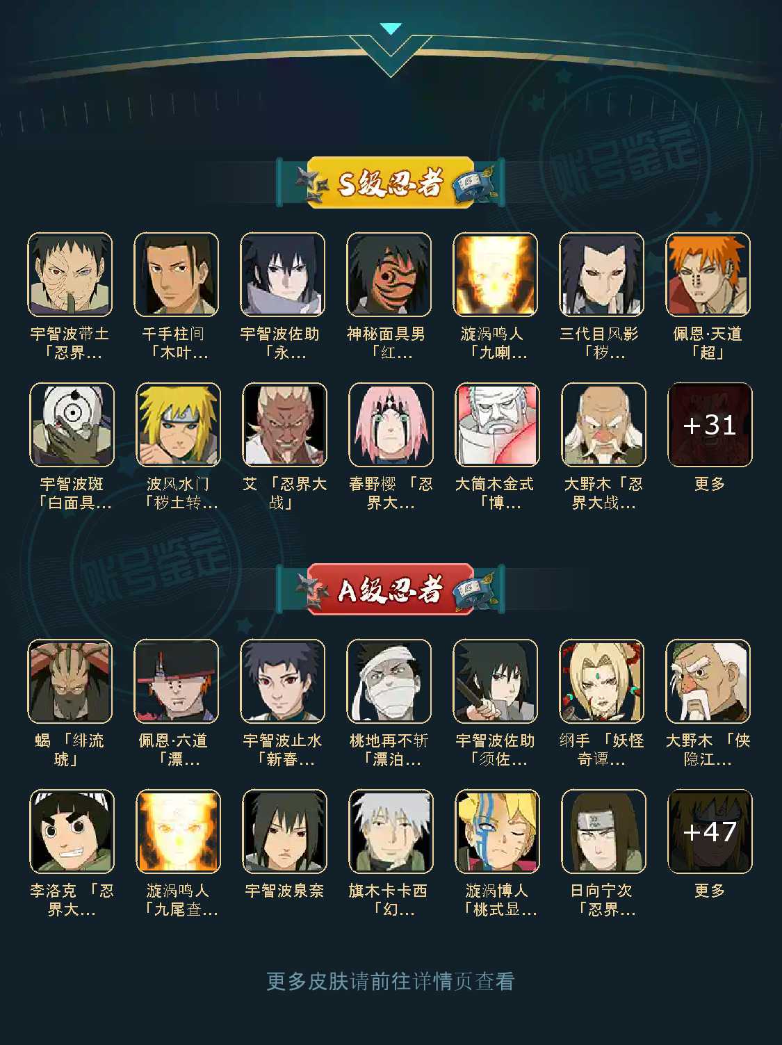 S忍42个;A忍51个,通灵兽26个,S忍:普通纲手猿飞日斩九喇嘛鸣人仙人自来也大蛇丸波风水门秽土柱间神秘面具男仙人兜永恒万花筒佐助忍战樱普通自来也豪杰自来也百豪纲手死门凯秽土水门秽土猿飞秽土扉间千手扉间千...