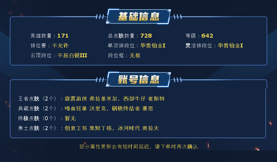 账号鉴定信息为平台系统检测得出,包含未拥有原皮的炫彩皮肤数,请以标题皮肤数为zhun。祝您把把都超神,天天拿5杀!认zhunID:剑道万古如长夜.