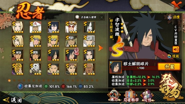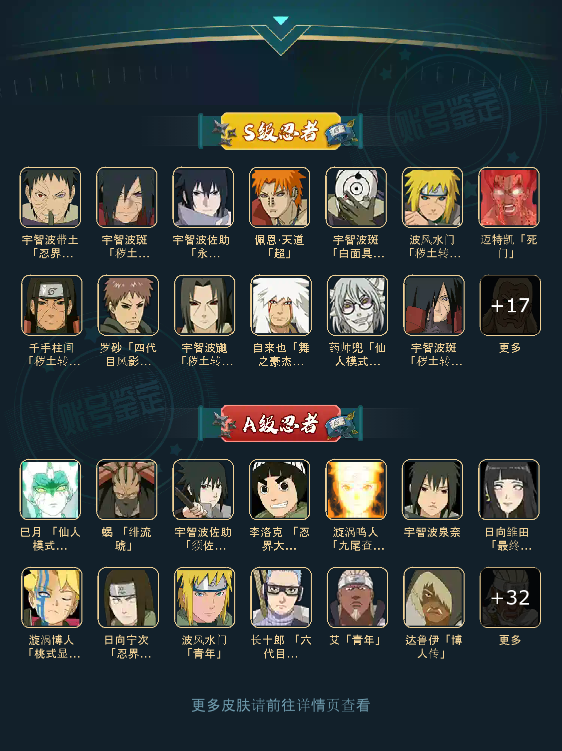 战力:1337W+;VIP11级;S忍30个;A忍36个,通灵兽20个,S忍:普通纲手猿飞日斩永恒万花筒佐助豪杰自来也大蛇丸百豪纲手波风水门秽土水门秽土猿飞秽土扉间千手柱间秽土柱间秽土斑秽土解斑秽土鼬神秘面具男白面具忍战带土罗砂四代艾三代艾