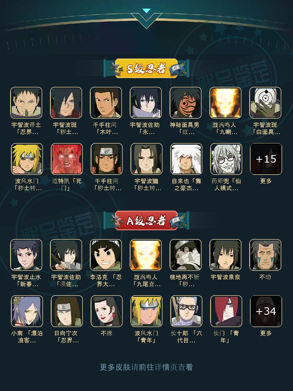 战力:1269W+;S忍27个;A忍41个,通灵兽18个,S忍:九喇嘛鸣人永恒万花筒佐助豪杰自来也大蛇丸普通纲手百豪纲手死门凯波风水门秽土水门猿飞日斩秽土猿飞秽土扉间木叶创立柱间秽土柱间秽土斑秽土解斑须佐鼬秽土鼬神秘面具男白面具忍战带土红夜