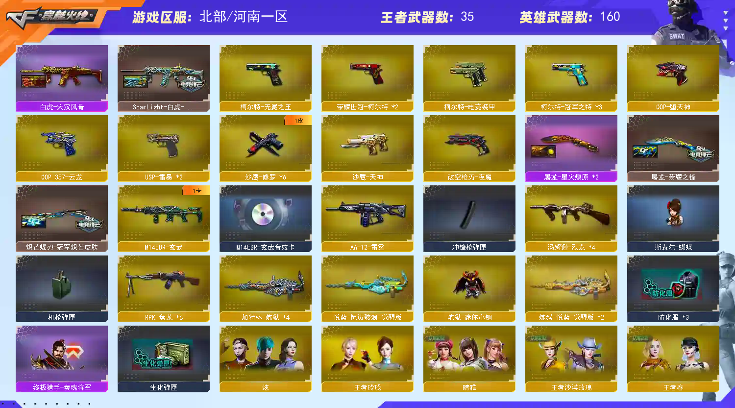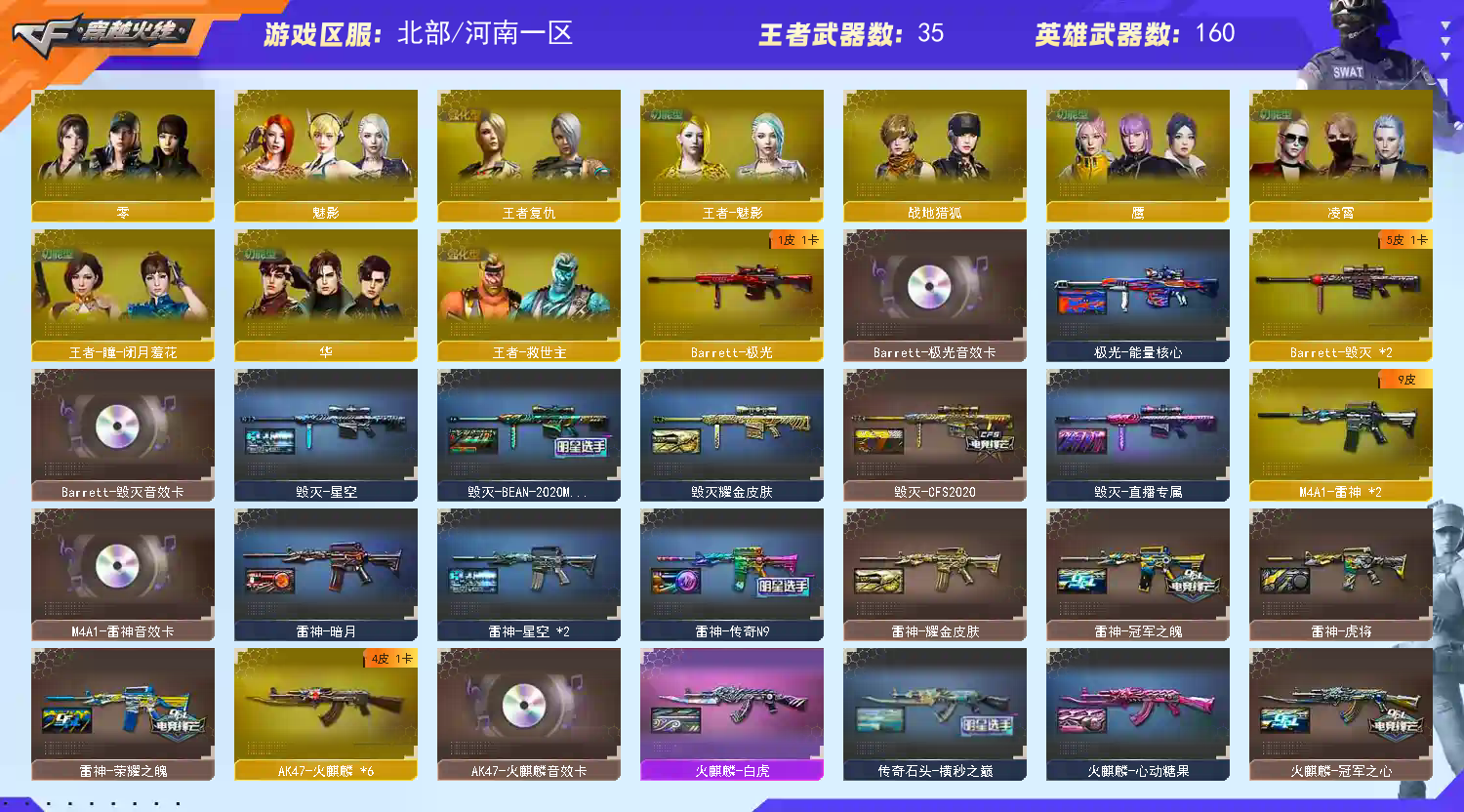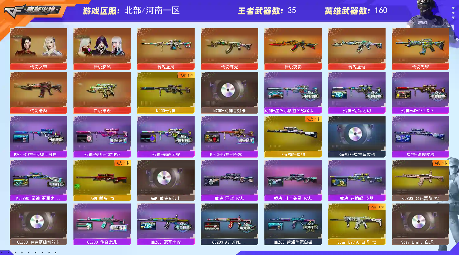 爆破:四防传说女帝 幻神质量7皮幻神音效卡 【冠军之幻+宠儿+N9+巅峰荣耀+世冠白鲨】 王者幻神 QBZ金色蔷薇X2 3皮音效卡 【冠军之薇+世冠白鲨+AG】 星神+冠军之星+星神音效卡+王者星神 白虎X4+冠军之虎+大汉风骨+白虎音效卡 6黑骑士 传说暗裔 传说夜影 3把冠军之特 2把USP雷暴 2把COP 2把世冠柯尔特满配副武器 冠军之刃 黄金猫猫手套 黄金鲨臂 裁决音效卡