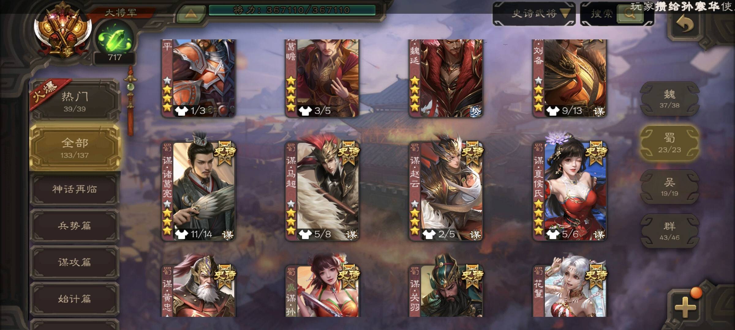 蜀——王平,诸葛瞻,谋马超,谋赵云,谋夏侯氏,花鬘,界黄忠,马云騄,张星彩,董允,赵襄,关索,沙摩柯,周群,谯周,谋刘备,某黄忠,谋孙尚香,鲍三娘,傅佥,谋诸葛亮,谋关羽,势魏延