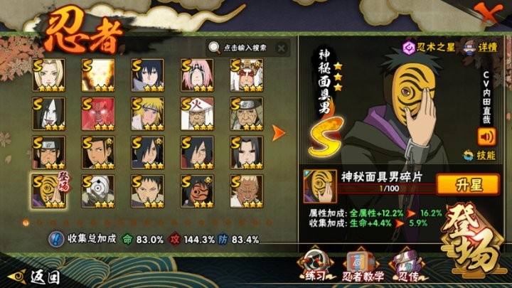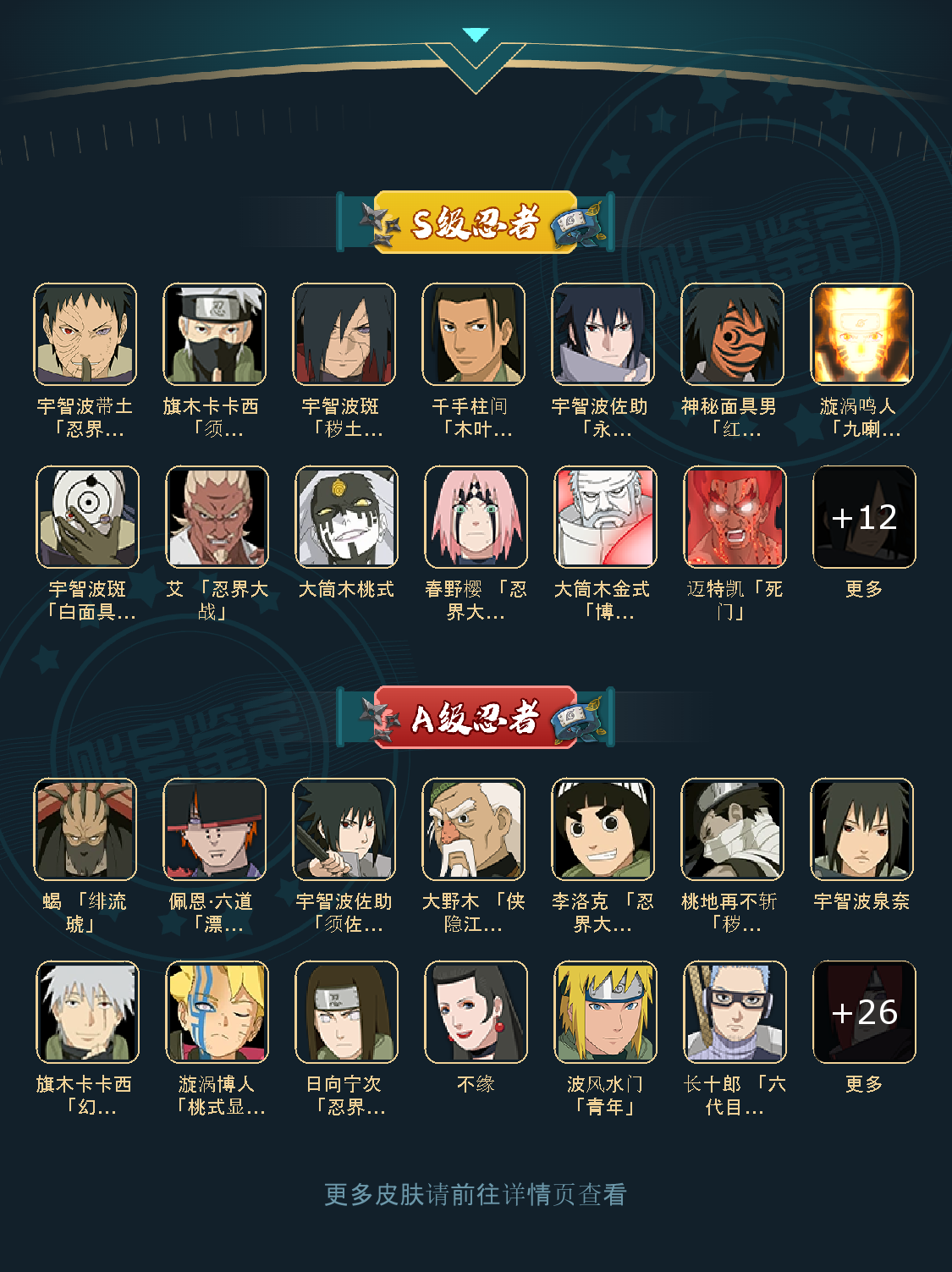 战力:1238W+;VIP11级;S忍22个;A忍33个,通灵兽21个,S忍:普通纲手九喇嘛鸣人永恒万花筒佐助忍战樱豪杰自来也大蛇丸死门凯波风水门秽土猿飞猿飞日斩秽土柱间木叶创立柱间木叶创立斑秽土解斑秽土鼬神秘面具男白面具忍战带土红夜面具男...展开全部