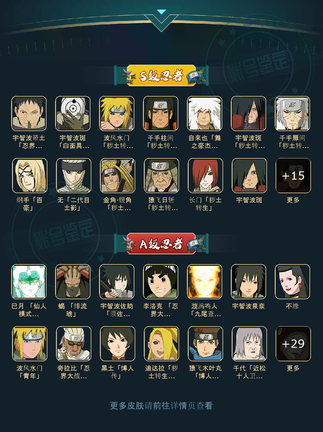 战力:1588W+;VIP11级;S忍26个;A忍34个,通灵兽18个,S忍:仙人自来也普通纲手猿飞日斩大蛇丸普通自来也百豪纲手波风水门秽土水门秽土猿飞豪杰自来也秽土扉间千手扉间千手柱间秽土柱间秽土斑宇智波斑须佐鼬神秘面具男白面具鬼灯幻月四