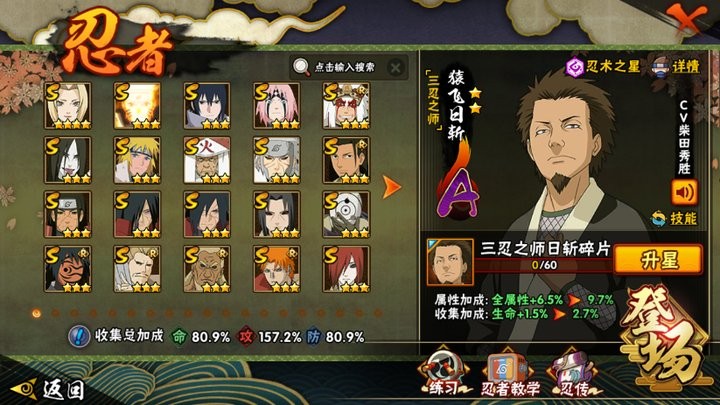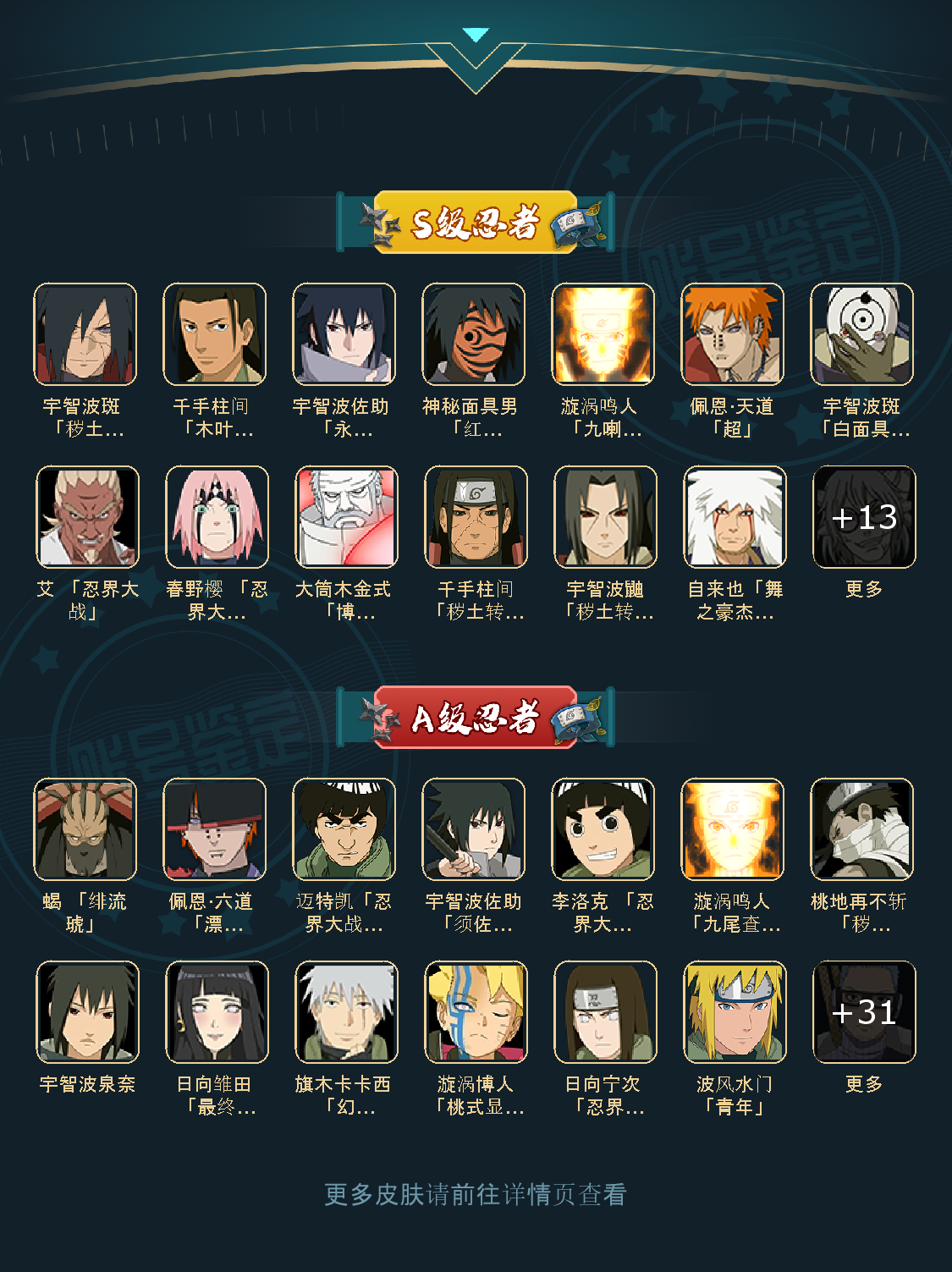 战力:1173W+;VIP13级;S忍22个;A忍37个,通灵兽20个,S忍:普通纲手九喇嘛鸣人永恒万花筒佐助忍战樱豪杰自来也大蛇丸波风水门猿飞日斩秽土扉间木叶创立柱间秽土柱间秽土斑秽土解斑秽土鼬白面具红夜面具男鬼灯幻月三代艾天道超秽土长门