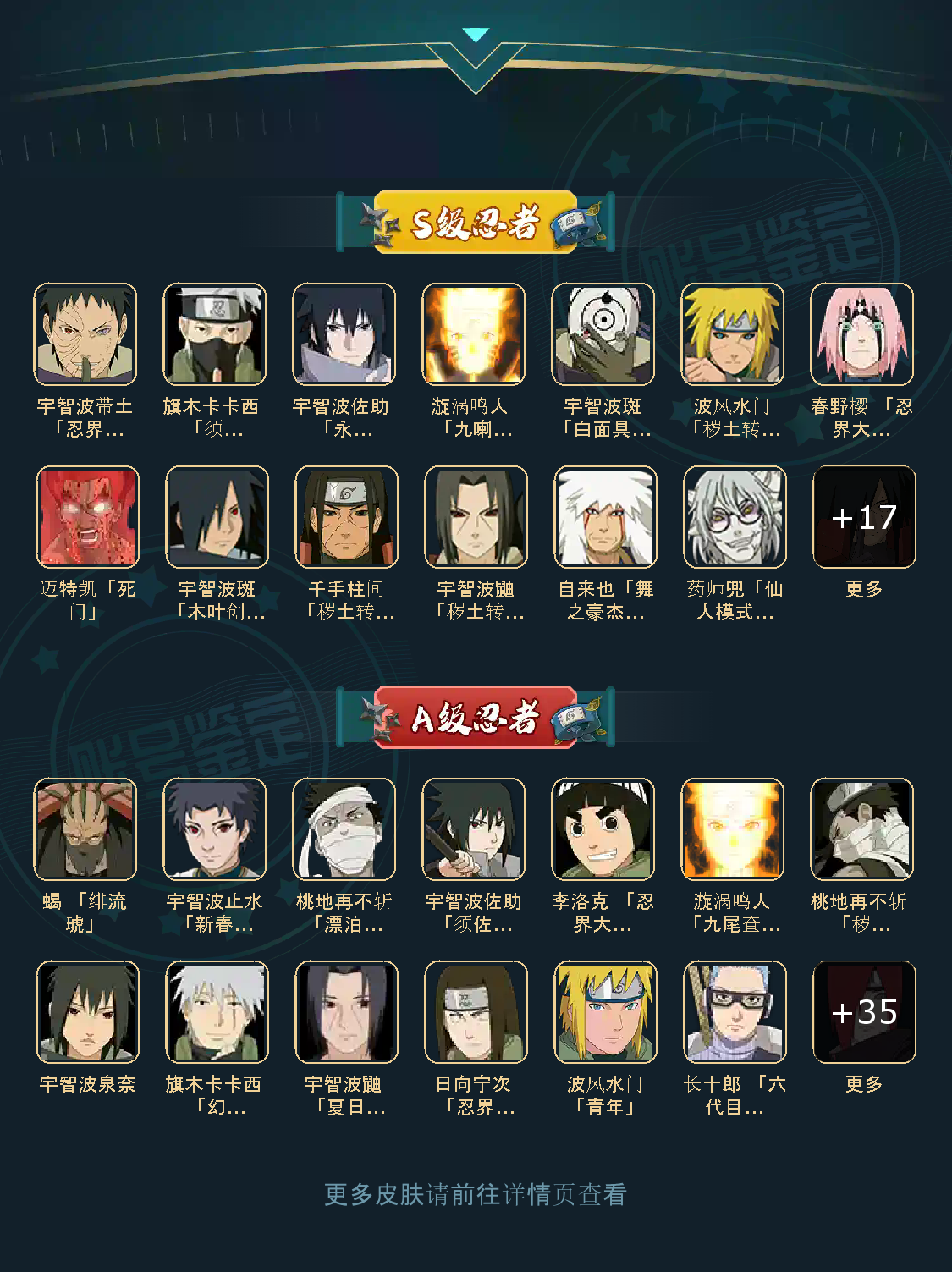 战力:1178W+;VIP10级;S忍30个;A忍40个,通灵兽19个,S忍:普通纲手猿飞日斩九喇嘛鸣人永恒万花筒佐助忍战樱仙人自来也大蛇丸百豪纲手普通自来也豪杰自来也死门凯波风水门秽土水门秽土猿飞秽土扉间千手扉间千手柱间秽土柱间秽土斑木叶