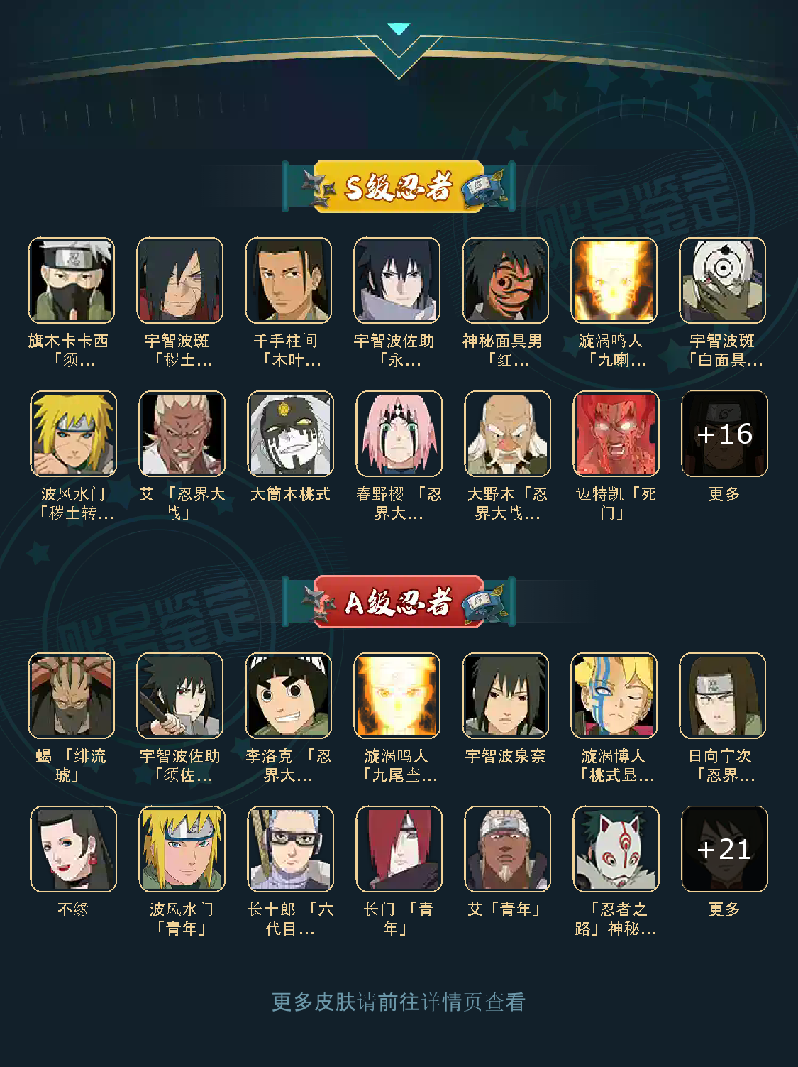 战力:1263W+;VIP9级;S忍28个;A忍27个,通灵兽17个,S忍:猿飞日斩九喇嘛鸣人永恒万花筒佐助忍战樱普通自来也百豪纲手普通纲手死门凯波风水门豪杰自来也秽土水门秽土猿飞秽土扉间千手柱间木叶创立柱间秽土柱间秽土斑秽土解斑须佐鼬秽土