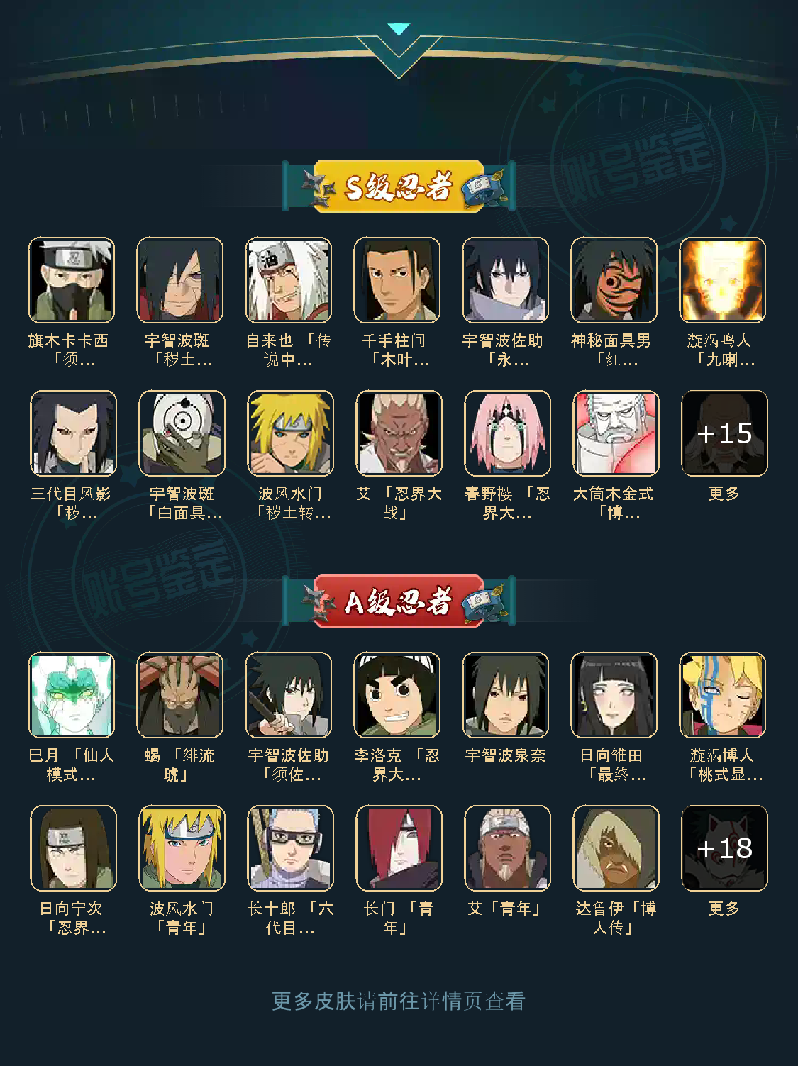 战力:1238W+;VIP11级;S忍23个;A忍23个,通灵兽18个,S忍:大蛇丸猿飞日斩九喇嘛鸣人永恒万花筒佐助忍战樱仙人自来也普通纲手死门凯普通自来也豪杰自来也波风水门秽土水门秽土猿飞秽土扉间木叶创立柱间秽土解斑白面具红夜面具男秽土三