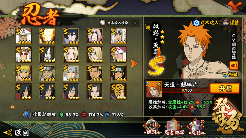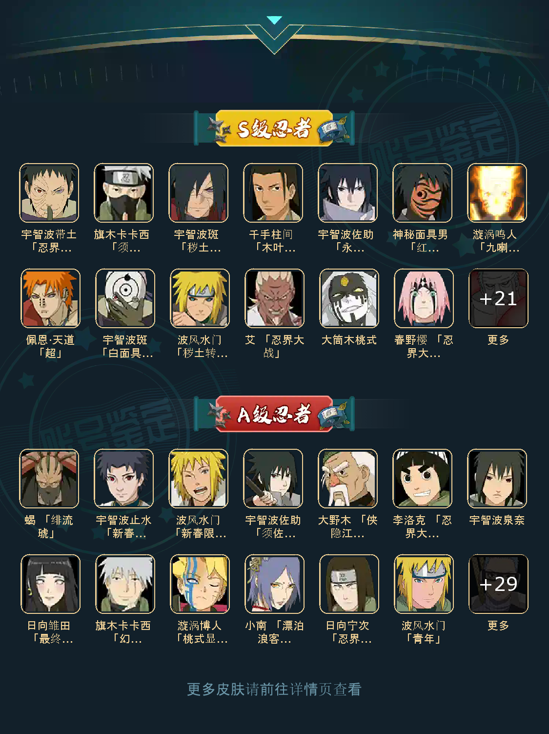 战力:1251W+;VIP11级;S忍30个;A忍34个,通灵兽19个,S忍:猿飞日斩九喇嘛鸣人永恒万花筒佐助忍战樱普通自来也大蛇丸百豪纲手普通纲手波风水门豪杰自来也秽土水门秽土猿飞秽土扉间木叶创立柱间秽土柱间秽土斑木叶创立斑秽土解斑秽土鼬