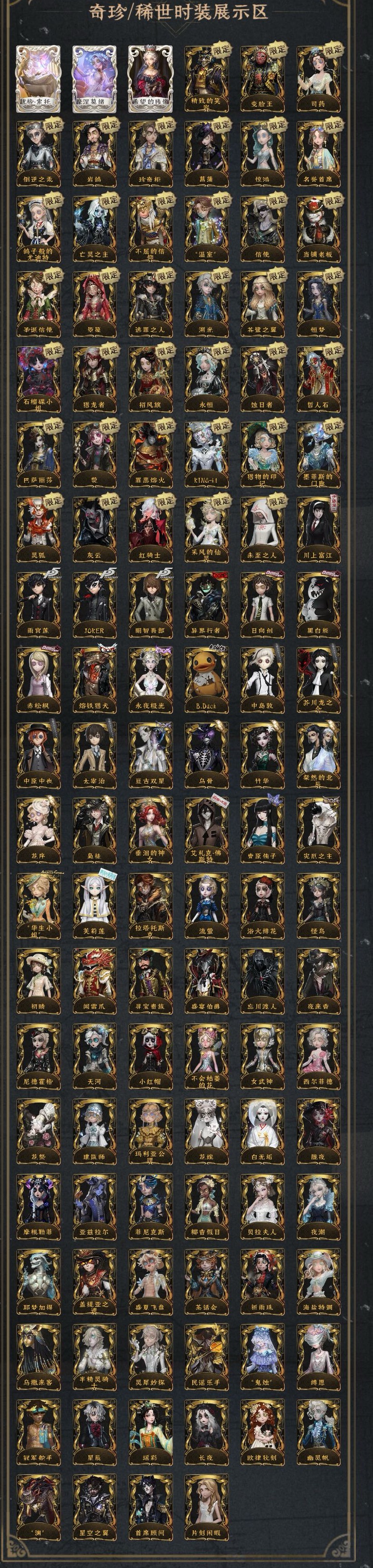 金皮:罪恶熔火.猎物的印记.KING-h1.灵狐.珍奇柜岩鸽.招风旗.永恒.蚀日者.猎龙者.巴萨丽莎.苍鹭之翼.哲人石.巴萨丽莎.信使.当铺老板.逃罪之.箜篌.菖蒲.惊鸿.名誉首席.精致的笑容..圣诞信使.倒逆之汞.亡灵之主.鸽子般的尤迪特.红骑士.灰云.温室.不屈的信仰.B.Duck.中岛敦.壹原侑子.艾札克·佛斯特.太宰治中原中也.芥川龙之介.Duck/赤松枫.日向创.明智吾郎.川上富江.灾厄之主.亘击双星.黑白熊.雨宫莲.JOKER.熔铁猎犬.异界行者.垂泪的神女.寻宝贵族.永夜极光.竹华.粲然的北辰.花序.星空之翼.首席顾问.幽灵帆.茶话会.长夜.椰香假日.祈雨珠.欧律狄刻.望足.贝拉夫人.夜潮.拉塔托斯克.鬼烛.冠军舵手.尼德霍格.忘川渡人.夜来香.花祭.玛利亚公理.花嫁.盛宴伯爵.小红帽.不会枯萎的花.白无垢.摩根勒菲.民谣乐手.海盐特调.乌撒来客.靛娑.半精灵骑士.流萤.灵犀妙探.浴火绯花.怪鸟.盖提亚之遗.盛夏飞盘.亚兹拉尔.菲尼克斯.女武神石.榴碟小姐.采风的仙灵.恒梦.溯光.司药“华生小姐.枭徒.瑶彩.西尔菲德.电竞皮拉拉队伍