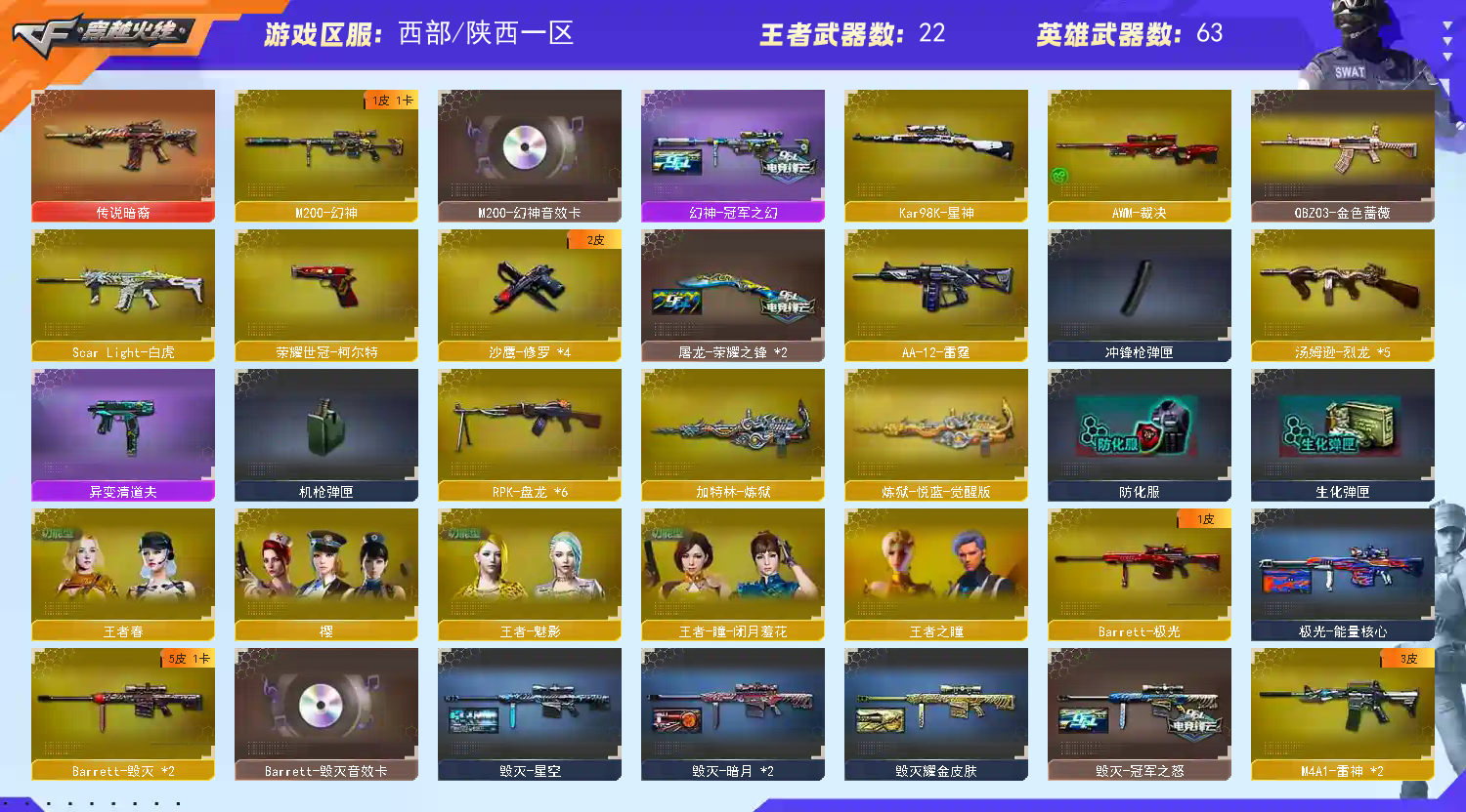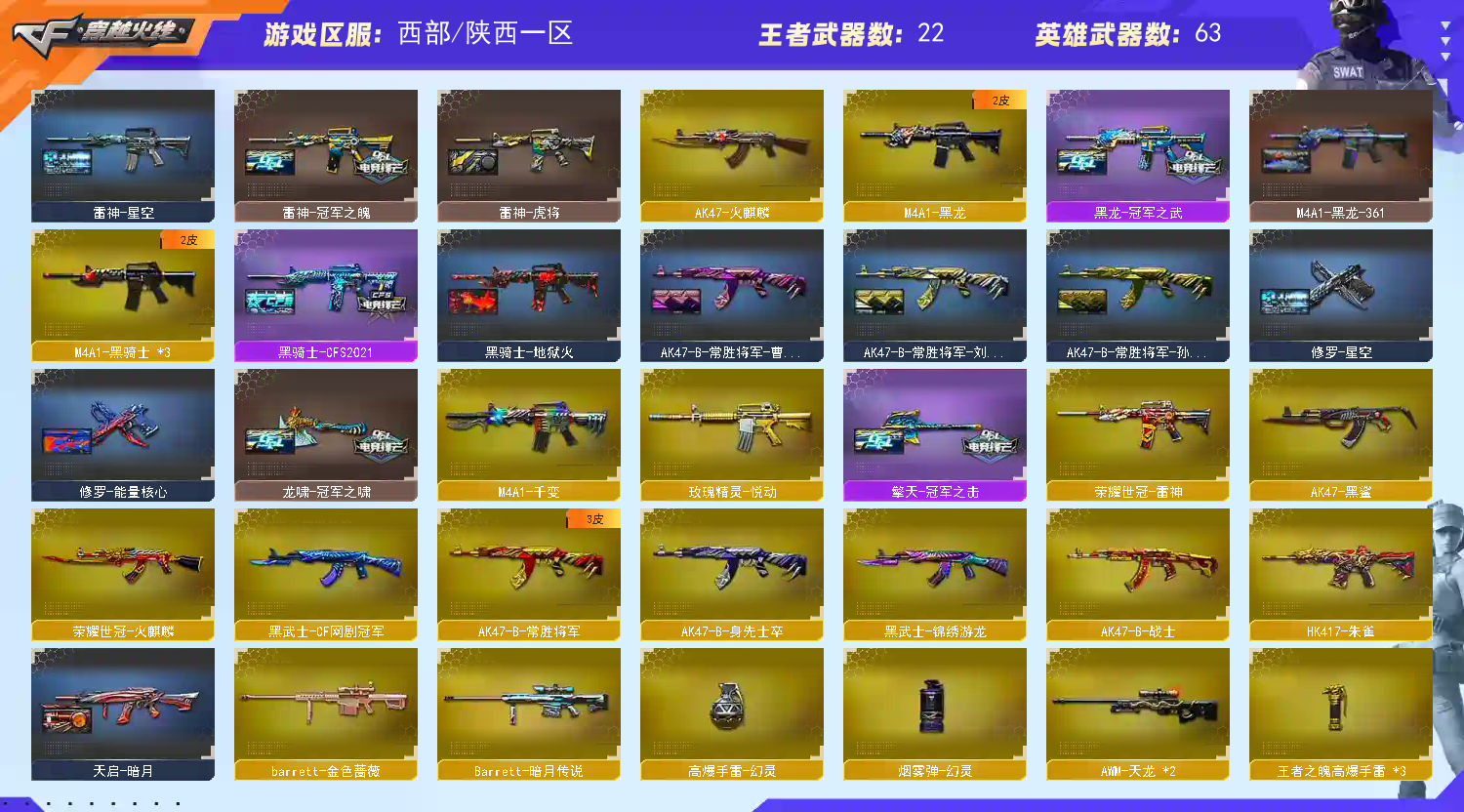 【重要武器皮肤】幻神-冠军之幻/极光-能量核心/巴雷特-毁灭-CFPL冠军/毁灭-冠军之怒/雷神-冠军之魄/黑龙-冠军之武/擎天-冠军之击/龙啸-冠军之啸/毁灭-星空/毁灭耀金皮肤/毁灭-暗月/天龙-CFSTAR/雷神-虎将/雷神-星空/黑骑士-CFS2021/黑骑士-地狱火/M4A1-黑龙-361/火麒麟-CFSTAR/火麒麟-AG/AK47-黑武士-361/AK47-B-常胜将军-刘备/AK47-B-常胜将军-孙权/AK47-B-常胜将军-曹操/天启-暗月/烈龙-星空/修罗-星空/修罗-CFSTAR/修罗-能量核心/屠龙-荣耀之锋