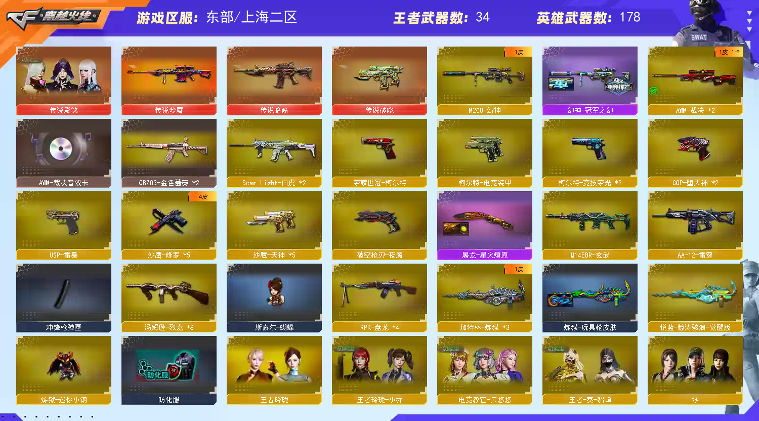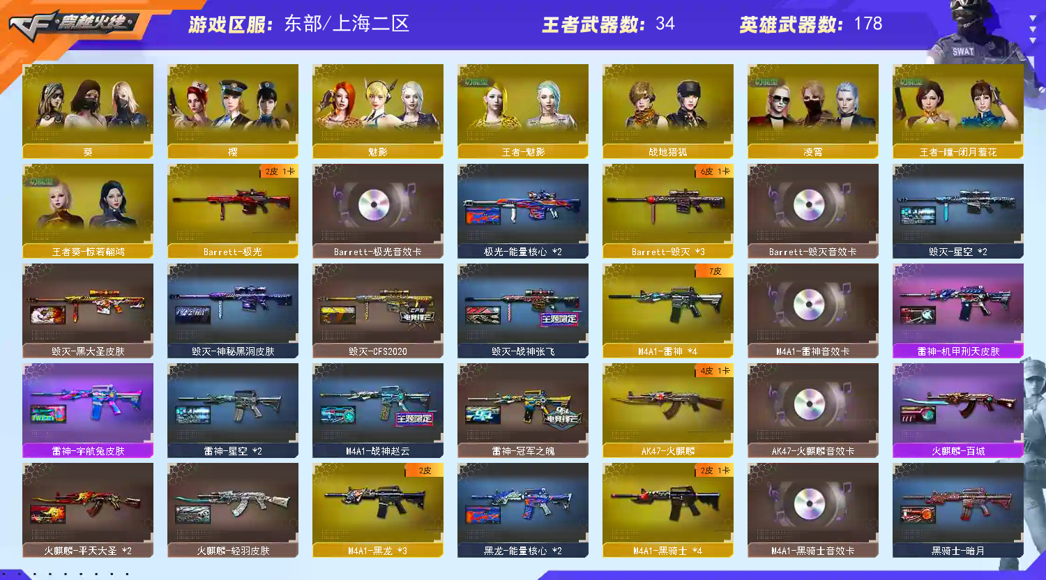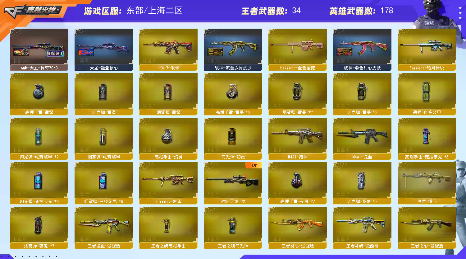 【其他重要武器】炫金黑龙/炫金雷神/炫金超新星/炫金毁灭/炫金修罗/火麒麟-暗月/M4A1-十二生肖·龙-雷神/M4A1-英雄-能量核心/激光毁灭者III(2)/机甲撕裂者III/冰龙粉碎者-白马银枪/AK47-冰龙粉碎者/AK47-烛龙/9A-91翡翠(2)/M4A1-狂欢-CFS/M4A1-破空冰刃/M4A1-十年火线/G3A3-SS-枪王排位/AK47-枪娘/AK47-轮回(2)/HK417-赤血龙魂/M4A1-XS-耀龙/AK12-枪王排位/9A91-赤血龙魂/AK47-死亡之翼/AK47-齐天大圣(3)/M4A1-PINK/AK47-破空冰刃(2)/M14EBR-赤血龙魂/QBZ03-烛龙/M4A1-电音/M4A1-情人节2019/AK47-肯德基/M14EBR-天羽/56式步枪-梨花(2)/M4A1-樱落/AK47-樱花/9A91-2017万圣节/M4A1-樱花(2)/AK-12-CFS2017纪念版/AK47-SS-9周年/M4A1-XS-翔龙/AN94-凤凰/AK47-苍龙/M14EBR-炎龙/M4A1-齐天大圣(2)/AK47-狂欢-CFS/M4A1-肯德基/AK47-万圣节2018/凤凰之魂(2)/凤凰之魄/M4A1-青龙./AK47-十年火线(2)/AK47-青龙/M4A1-樱(2)/M4A1-XS-赤龙/9A91-蓝色骑士/AK12-幽灵/M4A1-战龙(2)/AK47-B-十周年/M4A1-秘银赤龙(3)/海浪AK47-Q浏览器/M4A1-SS-枪王排位(2)/AK47-朋克/AK47-雷蛇/M14EBR-情人节2020/AK103-神秘黑洞/AK47-十二生肖-蛇/AK47-丹龙/黄金AK-47/Scar-Light-赤血龙魂/红龙AK47/AK47-圣诞节[2019]/HK417-红龙/AK47-绚樱/M4A1-Guitar 炫彩/AT15-万圣节/QBZ03-吕布/M4A1-圣诞2021/M4A1-紫狱/AK-103-火线13周年/M4A1-S-能量核心/神罚/AWM-2018圣诞(2)/AWM-涂鸦(2)/AWM-枪娘/M200-情人节2019(2)/AWM-十周年(2)/M200-万圣节2018(2)/AWM-蓝水晶/M200-圣诞(2)/雷蛇AWM/AWM-恶棍-枪王排位/AWM-圣诞2013/AWM-圣诞/AWM-A(2)/FN弩炮-CFS2017纪念版/凤凰之力(2)/AWM-深海猎手(2)/暗金M200(3)/M200-万圣节/AWM-Pink/AWM-7周年/蓝色魅影(2)/98K-蓝色骑士/M82A1-飞龙在天/黄金AWM/M200-青帝/AWM-摸金校尉/巴雷特-情人节2020/AWM-小故障/M82A1-封神/M200-神秘黑洞/破天狂龙/M200-赤血龙魂(3)/巴雷特-绚樱/98K-烛龙/Barrett-翔龙/Barrett-炎龙(2)/AWM-万圣节刀锋(2)/AWM-A-圣诞2021/Barrett-耀龙/凤凰之怒/Barrett-怒火大圣/AWM-S/MG4-蓝色骑士/阿梅利轻机枪-暗夜风暴/KAC-小动物(2)/KAC-赤烛/EVOⅢ-黑金传说/斯泰尔-CFS2017纪念版/雷蛇冲锋枪/EVOIII-萌杀/EVO III-赤血龙魂/P90-炫彩/征服者-毁灭之王 [Lv Max]/试炼破坏者III/神圣爆裂者/SPAS-12-雷电核心/AA-12-圣龙/Spas-12-黑金/阐释者III/沙鹰-雷蛇/沙鹰-青龙/沙鹰-枪王排位(3)/沙鹰-万圣节2018(4)/COP 357-青龙(3)/柯尔特双枪-2017万圣节/愤怒公牛左轮-枪王排位/凤凰之灵/COP 357-平天大圣(2)/Anaconda-雷电核心(3)/柯尔特-百城/COP357-十二生肖·羊/新USP-枪王排位奖励(3)/COP 357--绚樱(2)/COP357-神秘黑洞/愤怒公牛左轮-丹龙/Anaconda-万圣节2019/Anaconda-黑金神龙/Anaconda-炽焰核心/幻影沙鹰-枪王排位/幻影Anaconda-枪王排位/COP 357-万圣节2020/新USP-怒火大圣/Cop357-赤龙/修罗-摸金校尉/金刚伞-电玩红兔/丛林匕首-枪王排位/军用铁锹-飞龙在天(2)/啸天/军用铁锹-赤龙(2)/收割者-枪王排位/军用手斧-能量核心/斩神刀-青帝/猫猫手套/唐刀-九五至尊(3)/丛林匕首-卧龙(3)/鹰爪-枪王排位/尼泊尔军刀-战龙/虹光丛林匕首-枪王排位/虹光鹰爪-枪王排位/幻影扳手-枪王排位(2)/尼泊尔-炎龙/闪光弹-枪王排位(3)/胜利奖杯闪光弹-枪王排位(3)/胜利奖杯手雷-枪王排位/手雷-能量核心/红色诅咒娃娃手雷