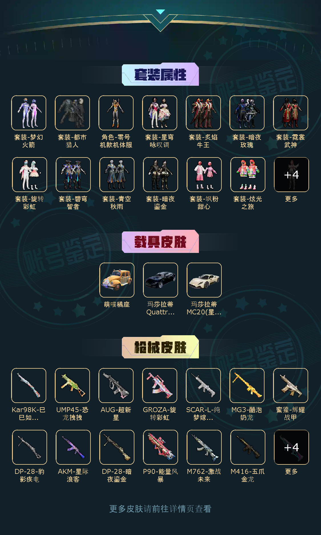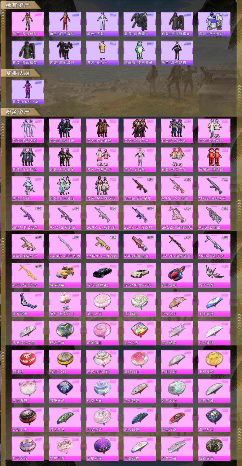 【粉色枪皮】M416-五爪金龙/M416-心之恋语/M762-激战未来/AKM-梦之光华/AKM-星际浪客/SCAR-L-纯梦嫁纱/SCAR-L-青春物语/GROZA-旋转彩虹/AUG-超新星/蜜獾-辉耀战甲/Kar98K-巳巳如意/UMP45-恐龙拽拽/P90-能量风暴/DP-28-暗夜鎏金/MG3-洛神天依[2级]/MG3-酷泡奶龙