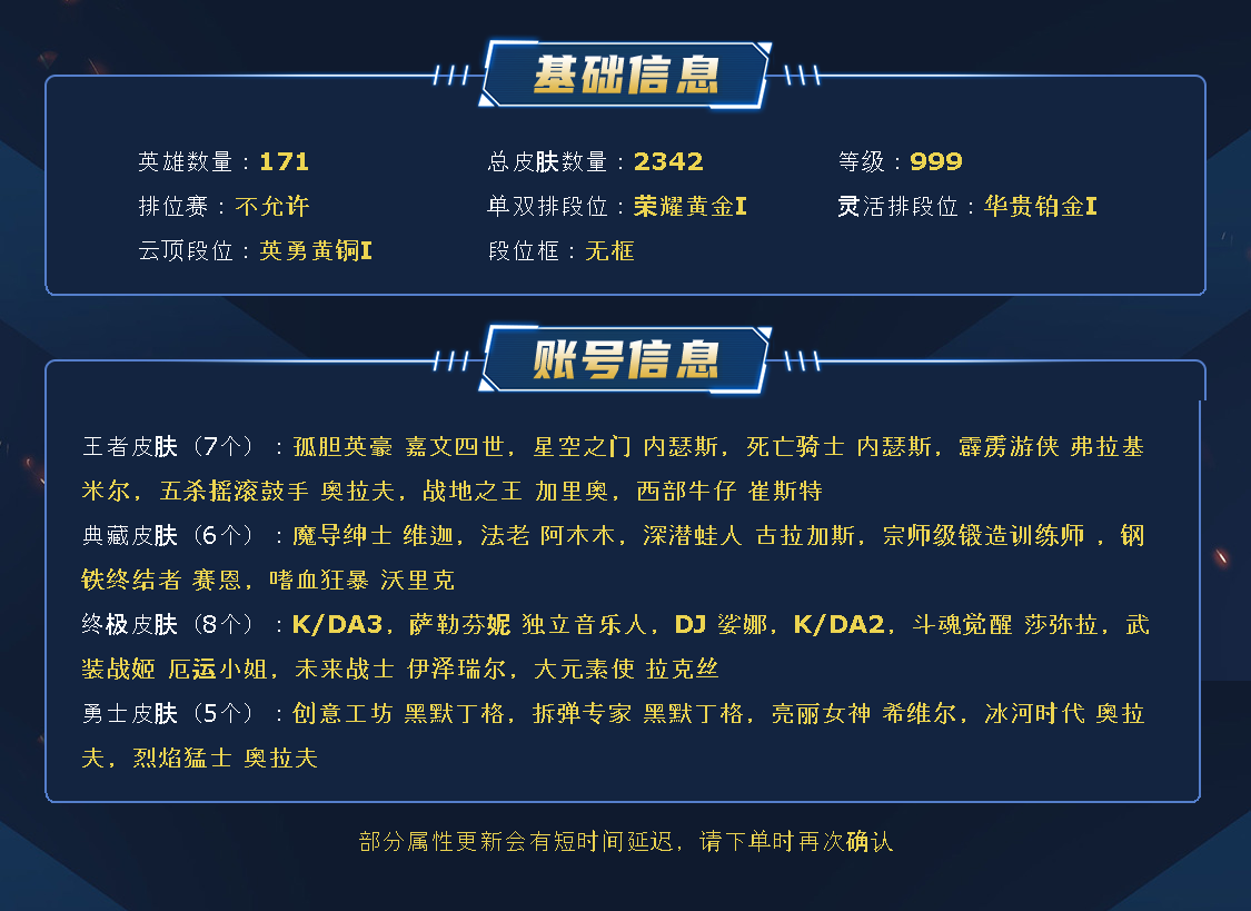 ~~喜欢记得收藏~~可排位~~2300皮全英雄丨1305原皮956炫彩丨90神话/至臻/海克斯丨神龙尊者套丨灵魂莲华套丨幻灵套丨星之守护者套丨KDA套丨情人节套丨执事套丨女帝套丨海之歌套丨至高天套丨太空律动套丨斗魂觉醒套丨破败军团套丨咖啡甜心套丨猫狗大战套丨光明哨兵套~~租之前尽量查一下游戏ID,确保段位是您需要的,避免浪费您的时间~~请勿挂机逃跑故意送人头,谢谢合作,谢谢~~