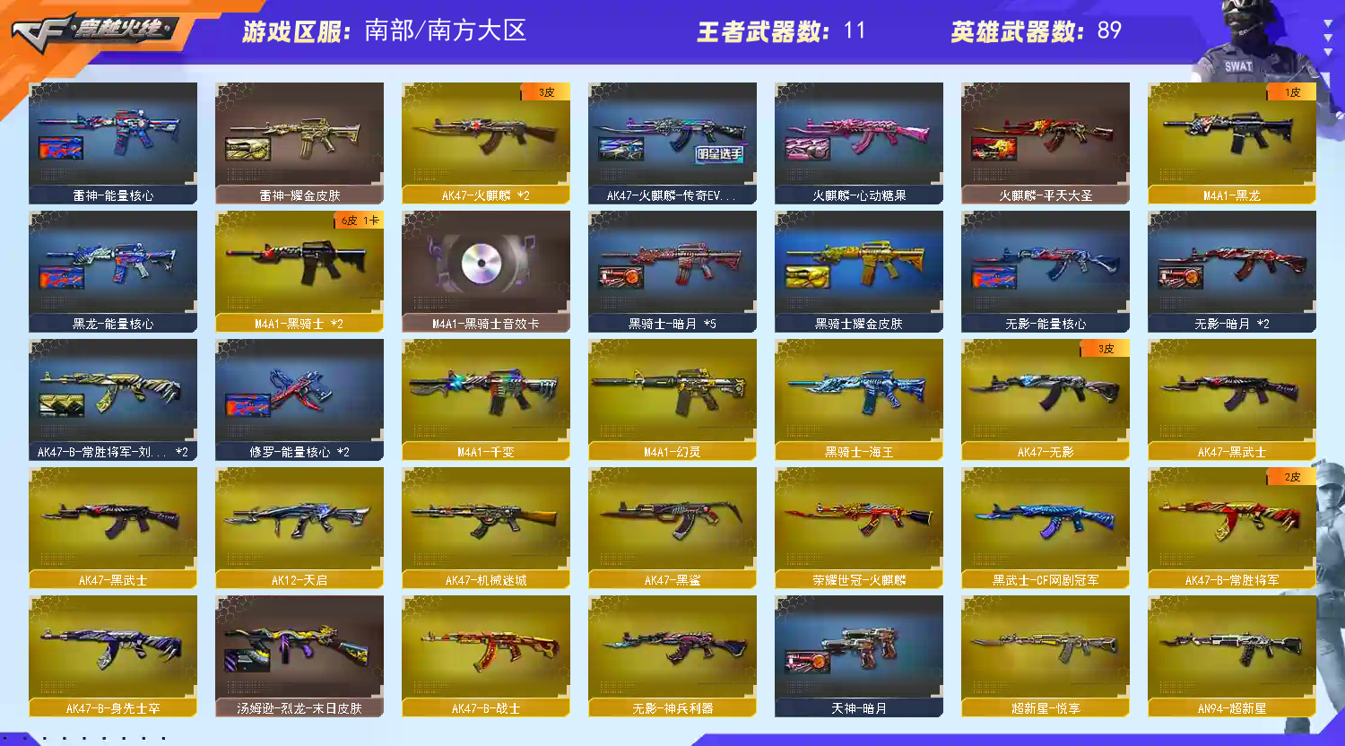 【重要武器皮肤】幻神-电流骇客 皮肤/毁灭-星空/毁灭耀金皮肤/毁灭-暗月/极光-能量核心/天龙-CFSTAR/天龙-秘银/天龙-能量核心/AWM-裁决-凤灵皮肤/AK47-火麒麟-传奇EVEN/火麒麟-CFSTAR/火麒麟-平天大圣/火麒麟-心动糖果/无影-暗月/无影-能量核心/AK47-B-常胜将军-刘备/AK-47-雷神/M4A1-千变-孔明皮肤/雷神-耀金皮肤/雷神-暗月/雷神-机甲刑天皮肤/雷神-能量核心/雷神-星空/雷神-维纳斯皮肤/M4A1-黑骑士-娜塔莉娅 皮肤/黑骑士耀金皮肤/黑骑士-暗月/黑龙-暗月/黑龙-能量核心/死神-秘银/天启-暗月/战神-紫绶金章皮肤/汤姆逊-烈龙-末日皮肤/烈龙-星空/修罗-CFSTAR/修罗-能量核心/天神-暗月/麒麟刺-萌杀皮肤