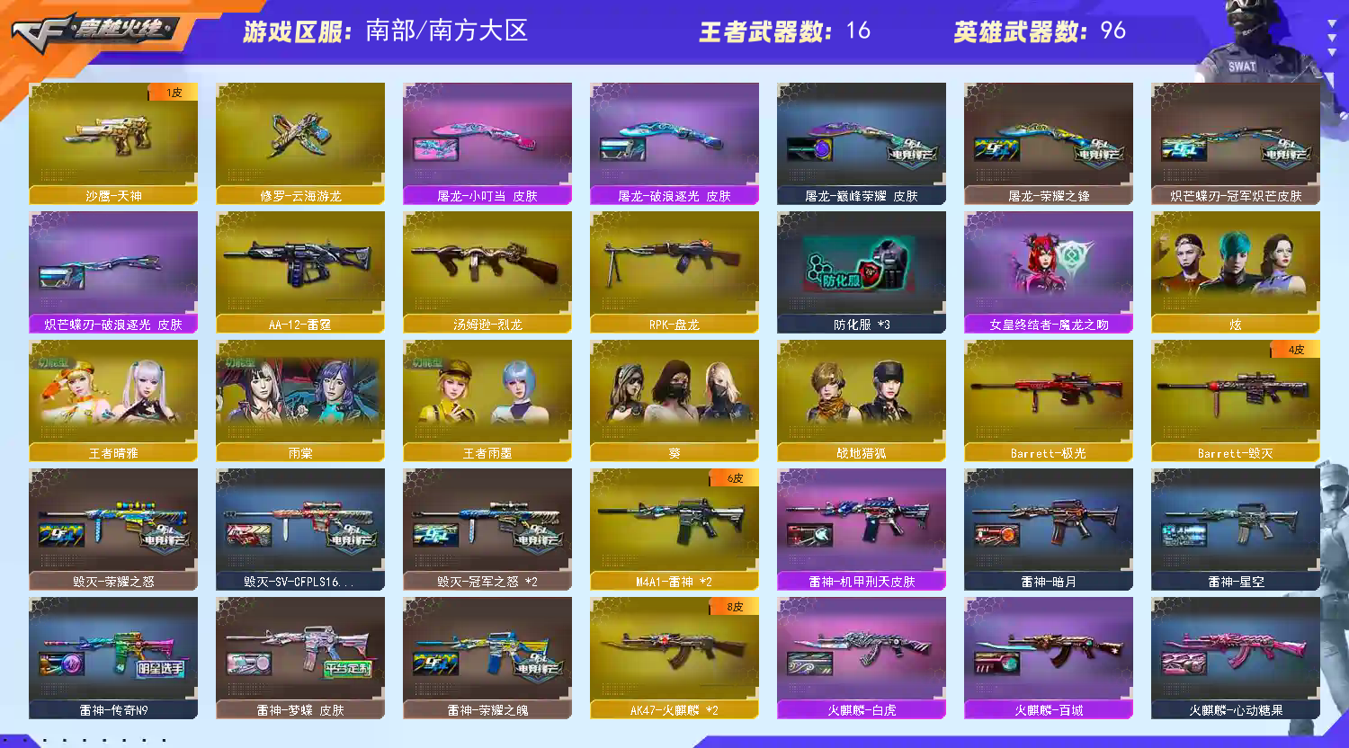 皮肤:幻神传奇欧欧 幻神Heartshot 幻神星火小队 幻神曹操 幻神2022 幻神N9 幻神宠儿 幻神冠军之幻 星神AG 白虎巅峰荣耀 白虎AG 白虎霓虹机甲 QBZ虎鱼 QBZ传奇宠儿 QBZ2024 QBZ破浪逐光 幻影破浪逐光 屠龙小叮当 炽芒蝶刃破浪逐光 炽芒蝶刃冠军炽芒 屠龙破浪逐光 屠龙巅峰荣耀 屠龙荣耀之锋 雷神荣耀之魄