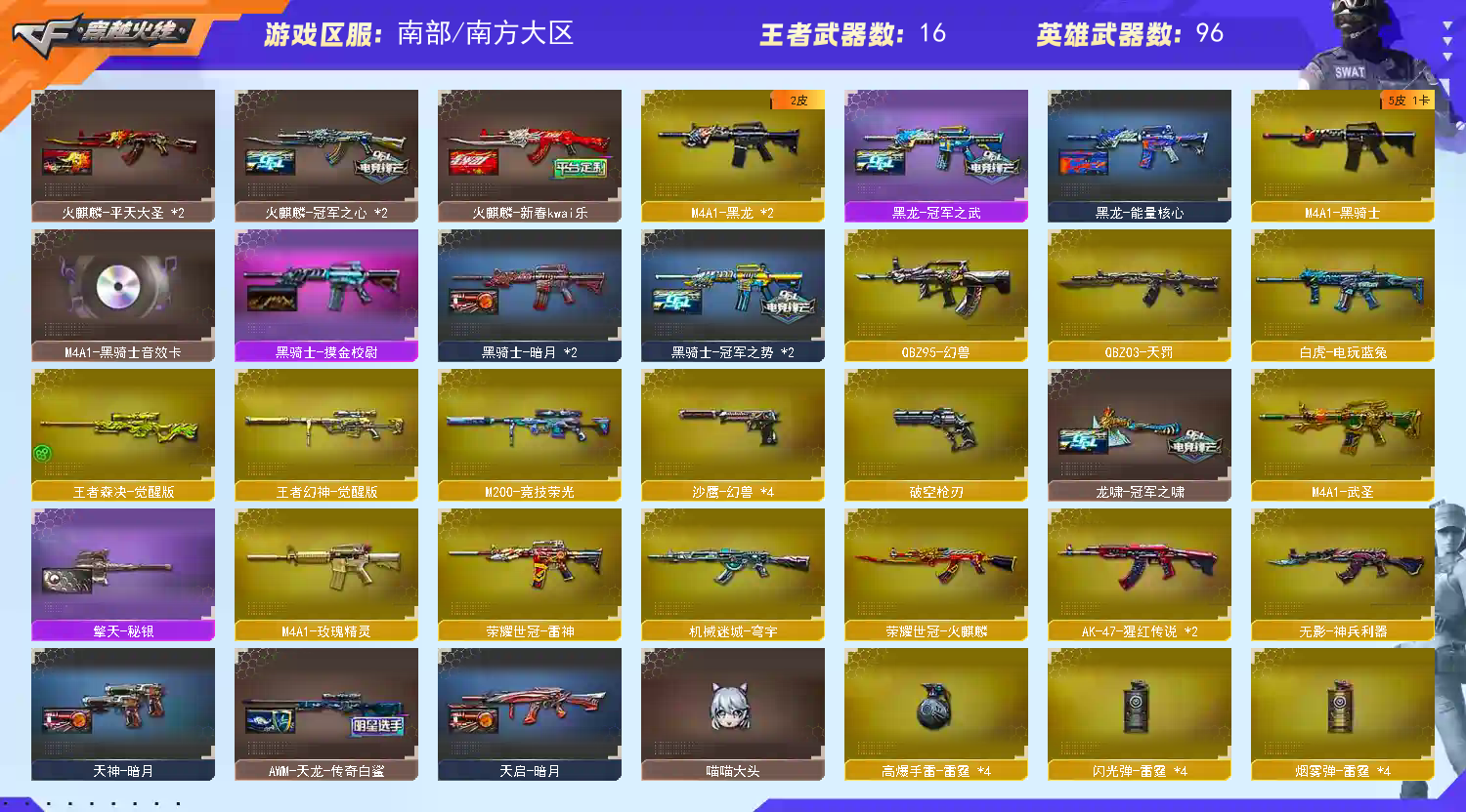 步枪:火麒麟 黑龙 雷神 黑骑士 武圣 白虎 G36C幻影 金色蔷薇古蛇 幻兽 玫瑰精灵 金色蔷薇 烈火 白虎电玩蓝兔 荣耀世冠火麒麟 荣耀世冠雷神 炫金超新星 炫金武士 马枪