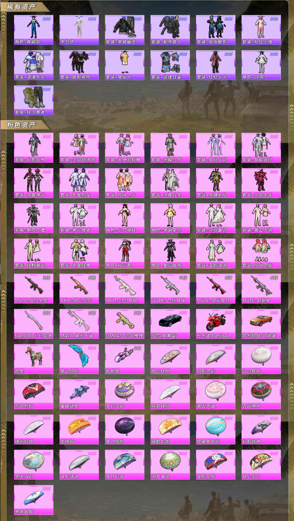 【稀有资产】角色-真嗣款战斗服/木乃伊套装/套装-寒蝎幽灵/套装-都市猎人/套装-暗夜魅影/套装-粉红小猪/套装-浪漫天命/套装-暗影哥特/套装-龟仙人/套装-迅捷狂鲨/套装-红红火火/角色-2P战斗服款/套装-狂沙舞者