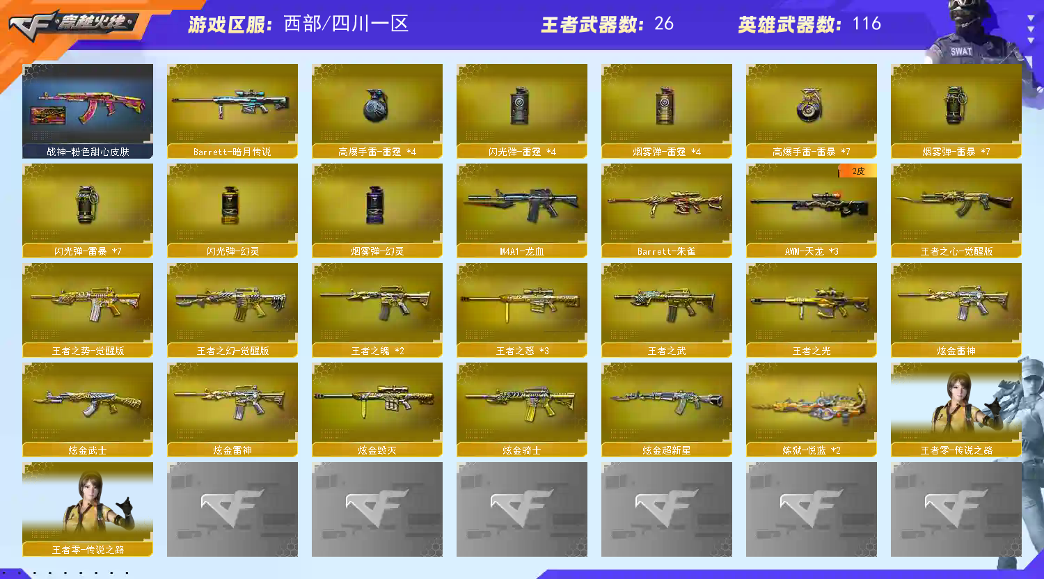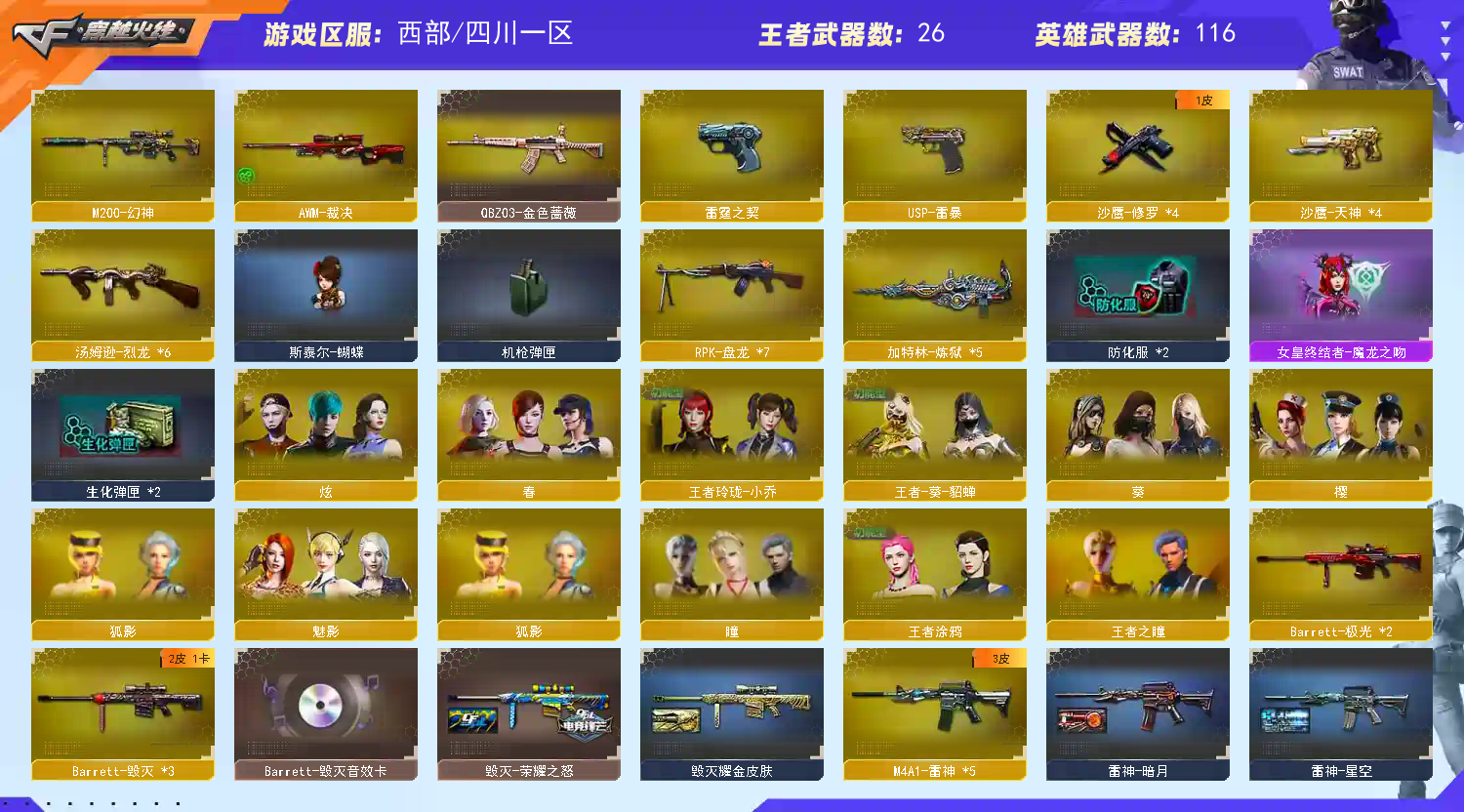 【允许排位】129v西部M200-幻神/21王者炫金/6烈7盘5炼狱斯泰尔蝴蝶/雷暴套USP雷暴