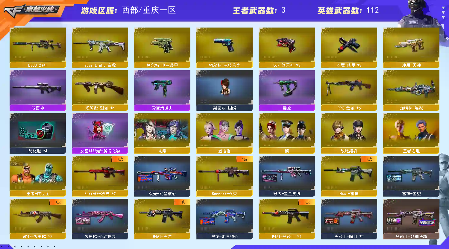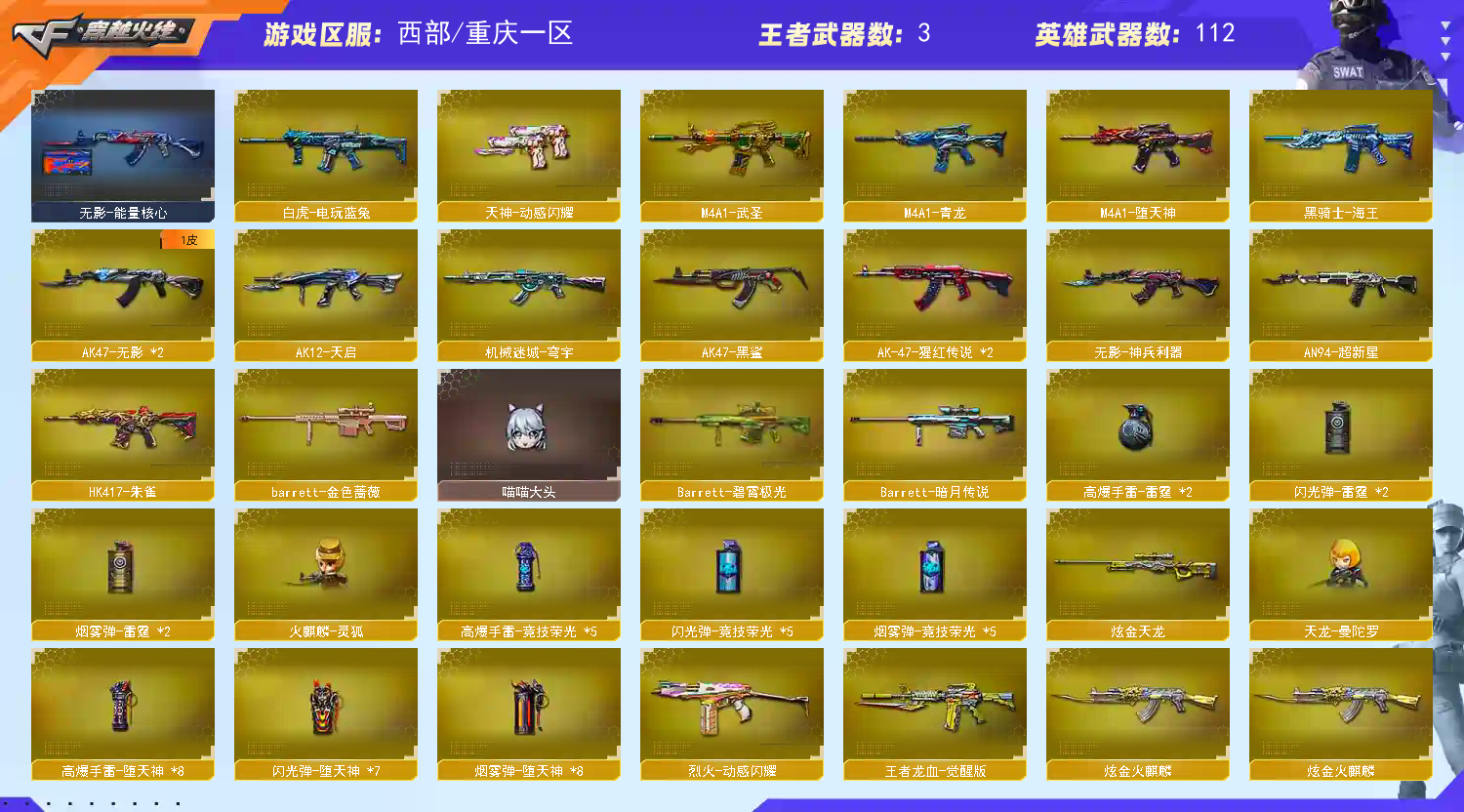 【主武器】火麒麟*2 黑龙 雷神 黑骑士*4 无影*2 天启 超新星 武圣 黑鲨 青龙 堕天神 朱雀 白虎 无影神兵利器 金色蔷薇古蛇迷踪 烈火 烈火动感闪耀 猩红传说*2 黑骑士海王 王者龙血 白虎电玩蓝兔 毁灭 极光*2 幻神 金色蔷薇大炮 暗月传说 盘龙*6 炼狱 烈龙*6 火麒麟猫爪 HK417朱雀蛇隐宗 M4英雄能量核心 大圣御雷神 黑武士暗月 魂雷神萌杀 魂死神机甲核心 魂9A91烈火电子连击*2 魂朱雀凤灵 魂M4雷神化蛇 魂QBZ03-金色蔷薇古蛇迷踪 魂QBZ03-金色蔷薇萌杀 魂QBZ03金色蔷薇蛇姬 魂黑骑士幻能朋克 魂黑骑士破浪10年 魂黑骑士现代金属*2 魂黑武士锋芒破茧 魂黑鲨青花瓷 魂火麒麟百城 魂雷神15周年嘉年华 魂雷神海滩派对 魂雷神维纳斯 魂雷神宇航兔兔 魂龙血锋芒破茧 火麒麟雷神 火麒麟灵狐 火麒麟能量核心 灵HK417-朱雀甜蜜火力I 灵黑骑士破解II 御超新星圣诞 御黑骑士哪吒闹海 御黑武士烈虎 御雷神机甲刑天 御雷神烈虎 御雷神小白龙 御麒麟18 源超新星 源黑龙 源火麒麟 源雷神 源天启 源黑武士 源黑骑士*2 源猎神 源玫瑰精灵 源武圣*2 炫金火麒麟 魂金色蔷薇蛇姬 魂朱雀新春神龙 魂毁灭黑曼巴 魂毁灭秦师 魂毁灭青帝 魂毁灭神秘黑洞 魂天龙彼岸花 天龙曼陀罗 御毁灭黑大圣 源裁决 源毁灭 源极光 魂炼狱电子连击 魂炼狱玩具枪 魂炼狱月 加特林炼狱掌火 御炼狱女娲 腐蚀激光超越6 集束激光超越MAX 火狱乱世超越MAX 毒蜂 异变清道夫 蝴蝶 死亡之眼