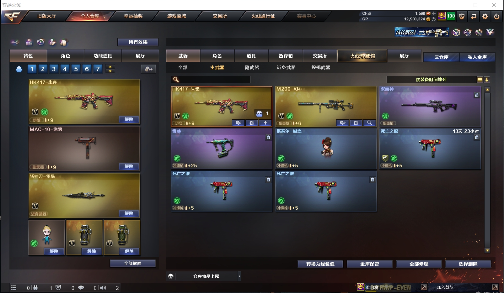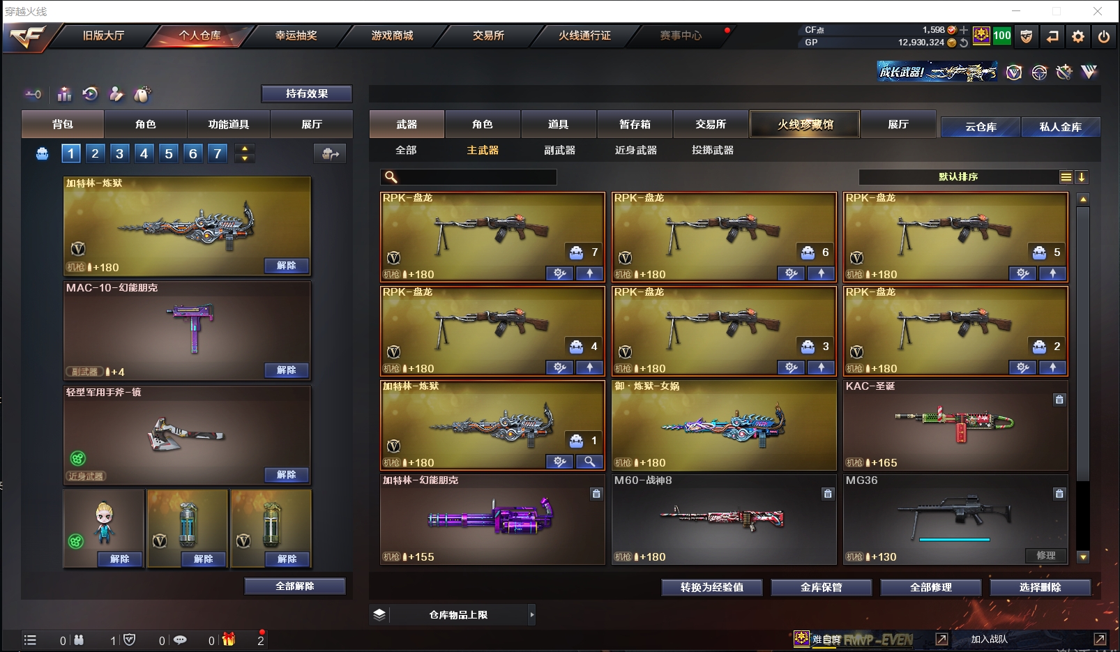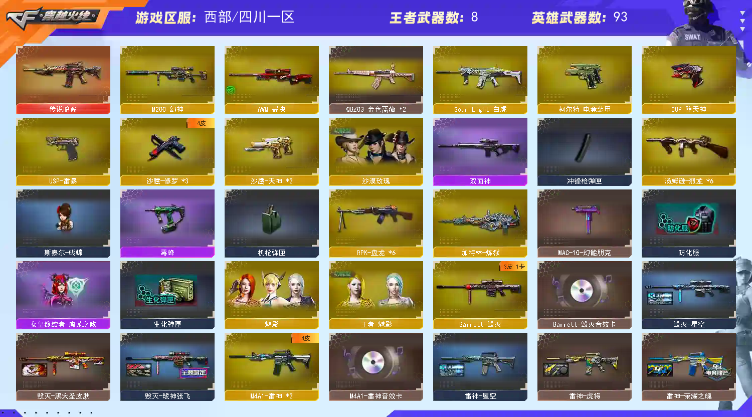 武器:6盘龙6烈龙 毒峰,加特林-炼狱,斯泰尔-蝴蝶,HK417-朱雀,传说暗裔,, 双面神,MAC-10-幻能朋克 COP-旗袍,COP-堕天神,幻神