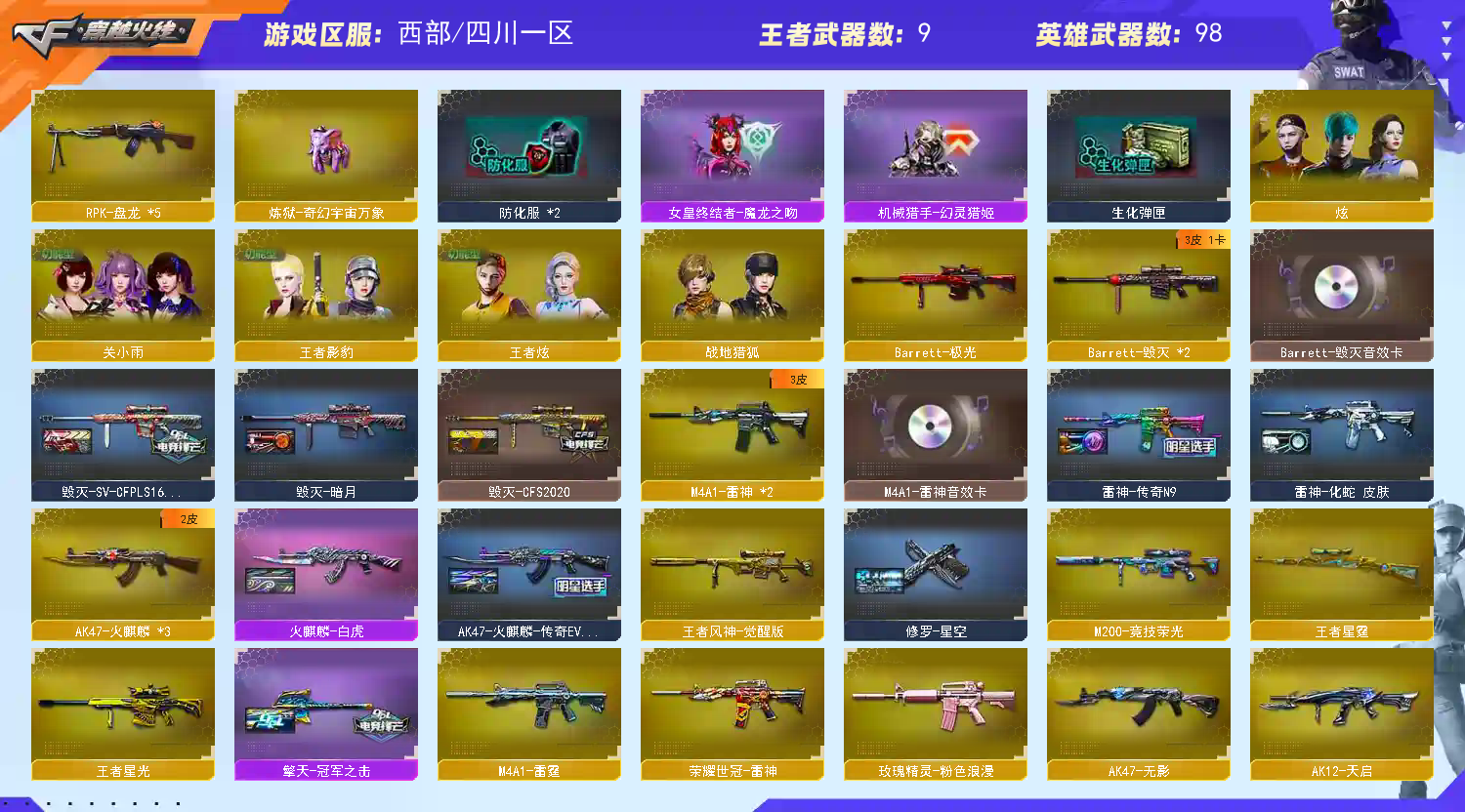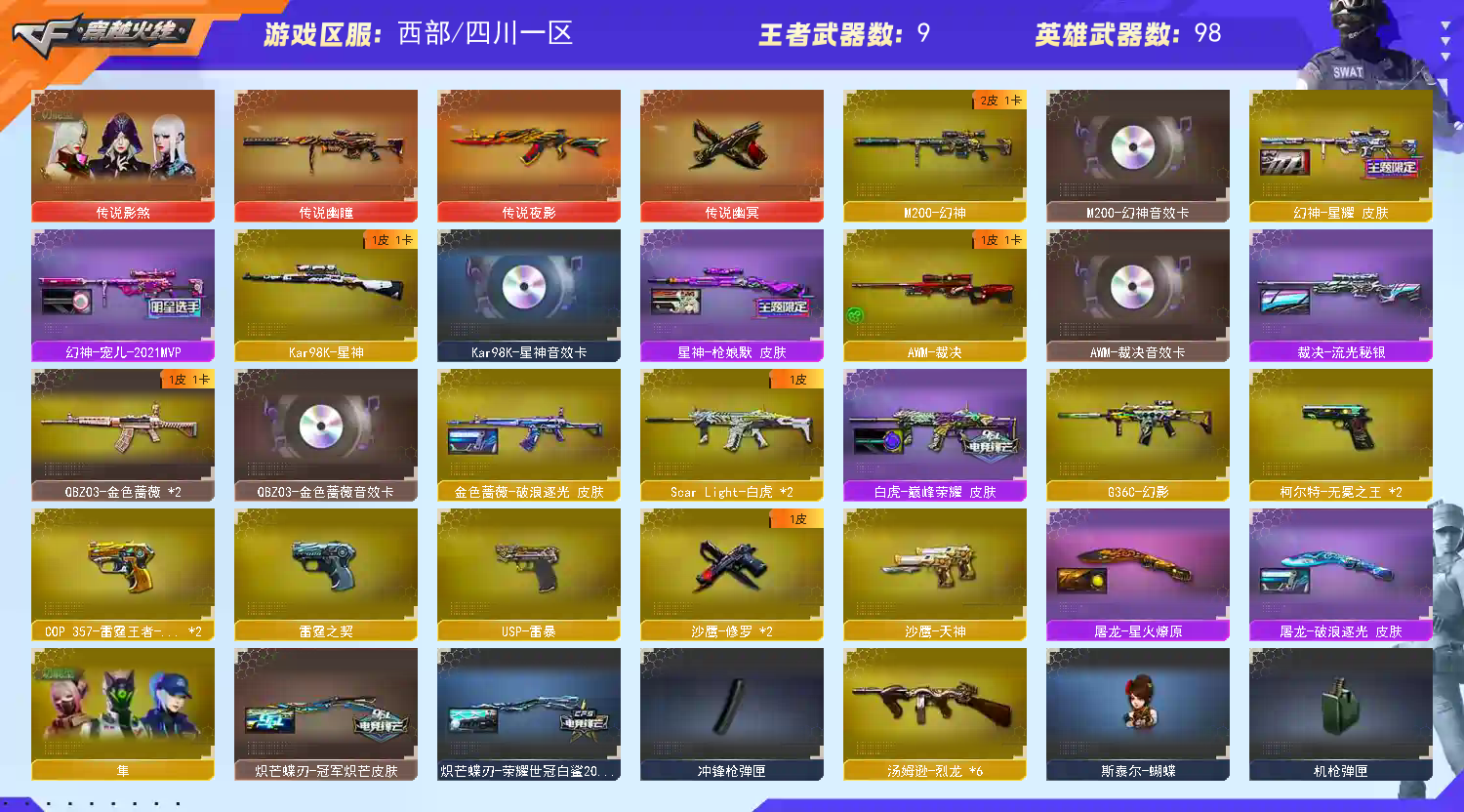 重要武器皮肤:幻神-宠儿-2021MVP、幻神-星耀 皮肤、星神-枪娘默 皮肤、毁灭-SV-CFPLS16冠军、毁灭-CFS2020、毁灭-暗月、裁决-流光秘银、AK47-火麒麟-传奇EVEN、火麒麟-CFSTAR、火麒麟-白虎、雷神-化蛇 皮肤、雷神-传奇N9、黑骑士耀金皮肤、金色蔷薇-破浪逐光皮肤、白虎-巅峰荣耀 皮肤、修罗-星空、屠龙-破浪逐光 皮肤、屠龙-星火燎原、擎天-冠军之击、炽芒蝶刃-荣耀世冠白鲨2023皮肤、炽芒蝶刃-冠军炽芒皮肤