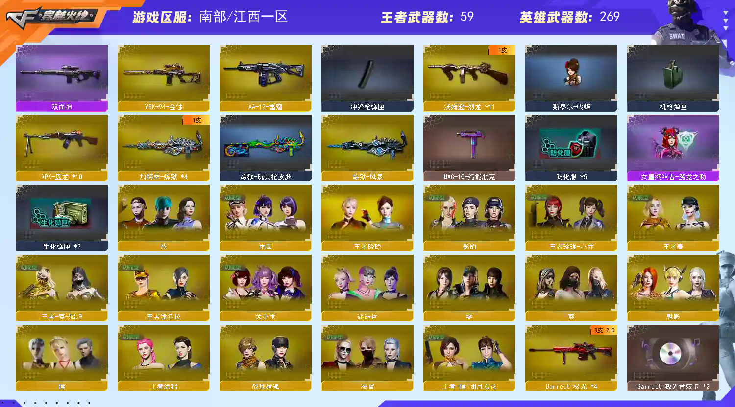 【幻神3件套!!!]【金色蔷薇3件套! !! 〗【m200幻神+幻神音效卡+宠儿皮肤+n9皮肤+ag冠军皮肤+电流骇客皮肤+usp雷暴+传说女帝】【98k星神+冠军之星皮肤]【传说圣灵 传说光曜]【王者白虎]【qbz03金色蔷薇+金色蔷薇音效卡+冠军之薇皮肤+ag冠军皮肤+荣耀世冠白鲨皮肤+破浪逐光皮肤+qbz03王者蔷薇+王者芳薇+qbz天罚]【g36c幻影+破浪逐光皮肤]【10盘龙+5炼狱+11烈龙+斯泰尔蝴蝶】【6黑骑士〗【雷暴套装]【雷霆王者套装]【荣耀世冠套装]【雷霆王者套装]【夜魔套装]【网剧冠军套装]【毁灭+毁灭音效卡+ag冠军皮肤+sv冠军皮肤]【火麒麟+火麒麟音效卡+呛娘皮肤+荣耀世冠ag皮肤]【雷神+雷神音效卡+宠儿皮肤+传奇n9皮肤+荣耀之破皮肤]【黑骑士+黑骑士音效卡+冠军之势皮肤+s4冠军典藏皮肤]【黑龙+黑龙音效卡]【极光+极光音效卡][王者雷怒 王者风势 王者之城王者之心 王者之翼 王者之魄 王者之势 王者之武 王者之烈 王者之光 王者之力 王者之怒】【烈火 天启 黑鲨 无影猎神 千变龙血死神黑骑士海王无影神兵利器超新星黑武士 白虎电玩蓝兔 超新星热带奇洋天龙黑武士锦绣游龙裁决】一【热门武器/小人呛]【雷神精英刀锋雷神小红 斯泰尔蝴蝶金钢伞]一【usp雷暴 cop堕天神 cop幻灵*2 cop雷霆王者*3荣耀世冠柯尔特 破空呛刃夜魔 武圣手呛 天神修罗 】一【幻灵之锋 雷霆王者之锋 龙啸 龙啸堕天神 马来剑夜魔尼泊尔雷霆 龙啸热带奇洋 麒麟刺擎天网剧冠军 擎天荣耀世冠龙啸 屠龙 王者之刺 王者之锋 王者之击 斩神刀雷暴 屠龙动感闪耀]一【堕天神投掷武器套装*2+幻灵投掷武器套装*8+竞技荣光投掷武器套装+雷暴投掷武器套装*6+雷霆投掷武器套装*2+雷霆王者投掷武器套装+夜魔投掷武器套装*7]一【角色]【4防传说女帝]【4防(关小雨 凌霄 影豹 雨墨 王者春 王者葵貂蝉 王者玲珑小乔 王者潘多拉 王者涂鸦 灵狐者职业经理 零热舞青春)]【迷迭香魅影 葵零瞳炫]