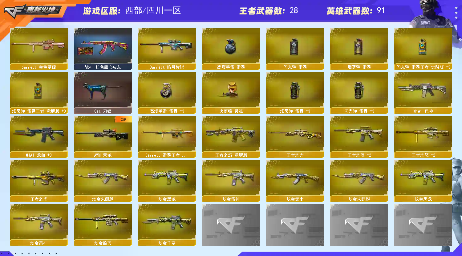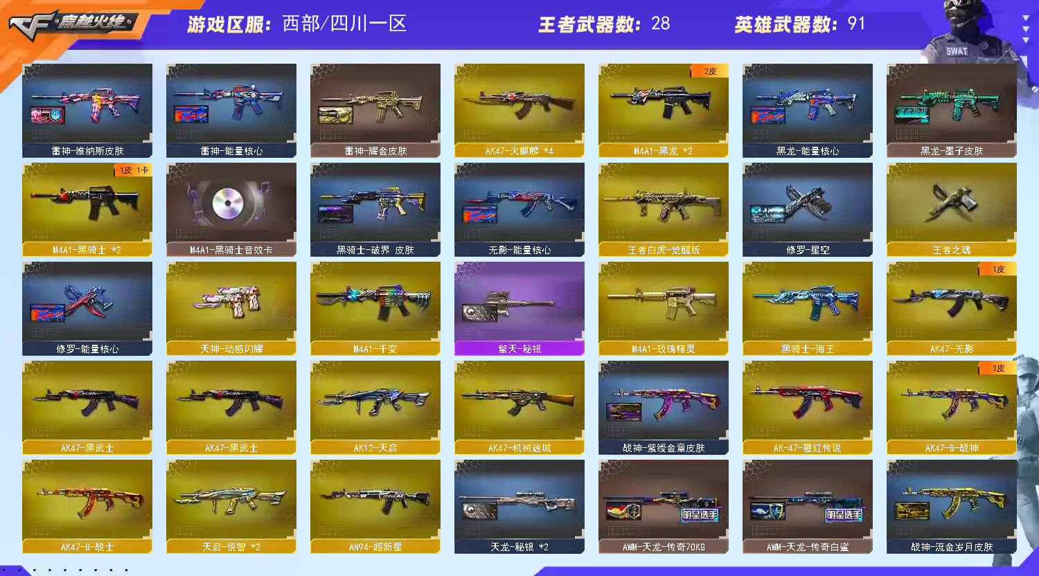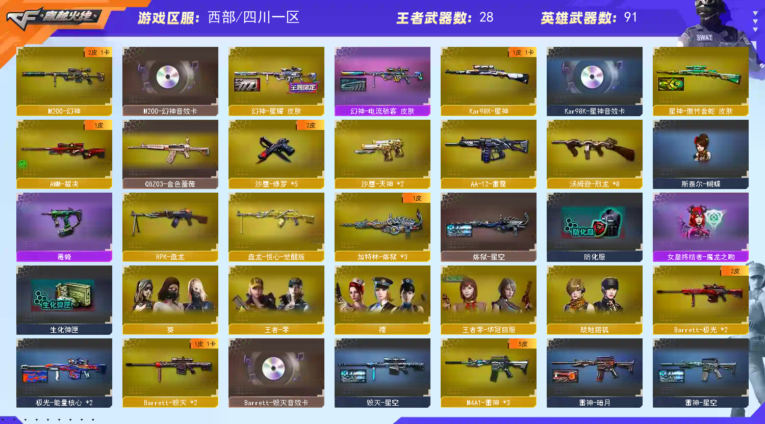 【其他重要武器】炫金武士/炫金雷神/炫金火麒麟/炫金千变/炫金黑龙/炫金毁灭/炫金修罗/M4A1-仙界-黑骑士/黑骑士-摸金校尉/M4A1-英雄-能量核心/AK47-冰龙粉碎者/激光毁灭者III/M14EBR-赤血龙魂(3)/AK-12-CFS2017纪念版/M14EBR-炎龙(2)/M4A1-圣诞2021(2)/M4CQBR-AP-孔明(2)/M4A1-S-能量核心/M4A1-秘银赤龙(2)/AT15-万圣节/M4A1-齐天大圣/M4A1-紫炎/M4A1-紫狱/火麒麟-桃园结义/黄金AK-47(4)/AK47-枪娘/M4A1-Guitar 炫彩/9A91-赤血龙魂(3)/AK47-破空冰刃/M4A1-破空冰刃/M4A1-电音/HK417-赤血龙魂/神罚(3)/AWM-Red/FN弩炮-CFS2017纪念版/barrett-战龙-圣诞/M200-WeGame/暗金M200/M200-青花瓷(2)/M82A1-夏日/M200-落樱/AWM-Pink(2)/M82A1-封神/AWM-十周年/破天九龙/M200-万圣节2018/AWM-恶棍-枪王排位/Barrett-翔龙(2)/AWM-蓝水晶/凤凰之力/M200-情人节2019/破天狂龙/巴雷特-绚樱/黄金AWM/巴雷特-情人节2020/AWM-T/M200-赤血龙魂(4)/M200-万圣节/暗金AWM/AWM-枪娘/AWM-万圣节2019/98K-蓝色骑士/98K-烛龙/AWM-2018圣诞/末日裁决者/巨龙咆哮Ⅲ(6)/M240B-卡通(2)/KAC-赤烛(2)/KAC-小动物/EVO III-赤血龙魂/斯泰尔-CFS2017纪念版/EVOIII- 曹操/Steyr TMP-CFS2020纪念版/斯太尔-能量核心/斯泰尔-巧克力/MK5-圣诞/雷蛇冲锋枪/神圣爆裂者(2)/Spas-12-黑金/Spas-12-幻能朋克/阐释者III/愤怒公牛左轮-枪王排位/蟒蛇-炫彩/Anaconda-雷电核心/沙鹰-枪王排位(2)/COP 357-平天大圣(2)/新USP-枪王排位奖励/USP-黑大圣/Anaconda-炽焰核心/COP 357--绚樱/幻影沙鹰-枪王排位/Cop357-赤龙/沙鹰-万圣节2018/沙鹰-雷蛇/凤凰之火/猫猫手套/蝴蝶刀-枪王排位/丛林匕首-卧龙(4)/啸天/尼泊尔军刀-9周年/闪光弹-枪王排位/手雷-能量核心/红色诅咒娃娃手雷