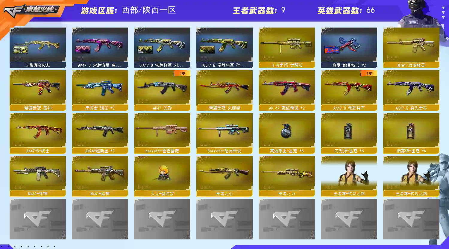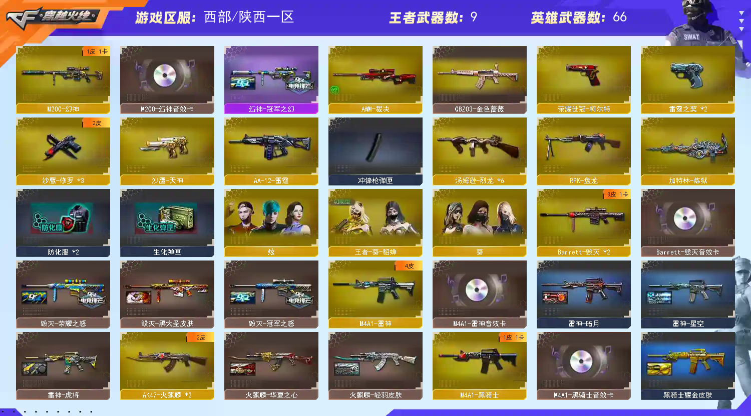 幻神冠军之幻+幻神音效卡✨世冠套+雷霆套☀金色蔷薇+貂蝉6烈不换弹☀ 重要角色】_葵/_炫/王者零-传说之路/王者-葵-貂蝉/新海豹突击队/流浪蔷薇/铁骑荣耀/铁骑-乘风破浪/零-水下丽影/灵狐者-黄金海岸/新灵狐者 【传说武器】 【英雄武器】_M200-幻神/ Barrett -毁灭(2)/ barrett -金色蔷薇/ Barrett -暗月传说/王者之怒-觉醒版/AWM-裁决/M4A1-雷神/荣耀世冠-雷神/M4A1-死神/M4A1-黑骑士/黑骑士-海王(2)/M4A1-猎神/M4A1-玫瑰精灵/AK47-火麒麟(2)/荣耀世冠-火麒麟/AK47-无影/AK-47-猩红传说(2)/AK47-B-身先士卒/AK47-B-常胜将军/AK47-B-战士/AN94-超新星(2)/ QBZ03 -金色蔷薇/9A91-烈火/RPK-盘龙/汤姆逊-烈龙(6)/AA-12-雷霆/加特林-炼狱/雷霆之契(2)/沙鹰-天神/沙鹰-修罗(3)/荣耀世冠-柯尔特/龙啸(2)/王者之啸-觉醒版/擎天/王者之击-觉醒版(2)/屠龙/雷霆之锋/王者之锋-觉醒版/高爆手雷-雷霆(6)/烟雾弹-雷霆(6)/闪光弹-雷霆(6) 【王者武器】王者之心/王者之力 【小人枪】天龙-曼陀罗/AWM-灵狐-15周年嘉年华/降世魔童/迷你深渊冰龙/魔能飞环-曼陀罗/生化手雷-机甲核心/高爆手雷-大乔/闪光弹-貂蝉 【其他重要武器】黑骑士-摸金校尉/M4A1-仙界-黑骑士/M4A1-英雄-能量核心/冰龙粉碎者-白马银枪/激光毁灭者III/AK47-轮回(3)/M4A1-电音/AK-12-恶棍/AK47-破空冰刃(2)/AK47-苍龙/M4A1枪王排位II/M4A1-秘银赤龙/AK47-朋克/AK47-枪娘/ QBZ03 -吕布/ M4CQBR -AP-孔明/M4A1-SS-枪王排位(2)/AK47-QT/G3A3-SS-枪王排位/M4A1-S-能量核心/AK-47-二次元(2)/黄金AK-47(3)/AK47-十二生肖-蛇(2)/M4A1-万圣节2刀-枪王排位/幻影双斧-枪王排位/斩神刀-青帝/斩魔刀-怒火大圣/丛林匕首-卧龙/军用铁锹-飞龙在天(2)/闪光弹-枪王排位(6)/胜利奖杯烟雾弹-枪王排位(2)/手雷-能量核心(2) 【重要武器皮肤】幻神-冠军之幻/毁灭-冠军之怒/毁灭-荣耀之怒/毁灭-黑大圣皮肤/天龙- CFSTAR /火麒麟- CFSTAR /火麒麟-华夏之心/火麒麟-轻羽皮肤/无影耀金皮肤/AK47-B-常胜将军-刘备/AK47-B-常胜将军-孙权/AK47-B-常胜将军-曹操/AK-47-雷神/雷神-虎将/雷神-暗月/雷神-星空/黑骑士耀金皮肤/战神-流金岁月皮肤/战神-紫绶金章皮肤/战神-粉色甜心皮肤/修罗- CFSTAR /修罗-能量核心 【重要光效】王者之心金色光效/王者之怒金色光效/M4A1-死神蓝色光效/RPK-盘龙蓝色光效/加特林-炼狱蓝色光效/屠龙蓝色光效/汤姆逊-烈龙蓝色光效/龙啸蓝色光效/AK47-火麒麟蓝粉色光效/加特林-炼狱蓝粉色光效/ Barrett -极光紫橙光效/M4A1-雷神紫橙光效 【重要音效卡】M200-幻神音效卡/M4A1-黑骑士音效卡/M4A1-雷神音效卡/ Barrett -毁灭音效卡 【重要戒指】15周年限定戒指/龙眼(死神)/龙眼(鹰)/金蛇戒/银蛇戒/16赛季纪念戒指-枪王耀金/17赛季纪念戒指-耀金/18赛季纪念戒指-耀金/20赛季纪念戒指-耀金/21赛季纪念戒指-耀银(拇指)/22赛季纪念戒指-耀铜(食指)/22赛季纪念戒指-耀银(拇指)/24赛季纪念戒指-耀铜(食指)/24赛季纪念戒指-耀银(拇指)/25赛季纪念戒指-耀铜(食指)/25赛季纪念戒指-耀铜(拇指)/26赛季纪念戒指-耀金(拇指)