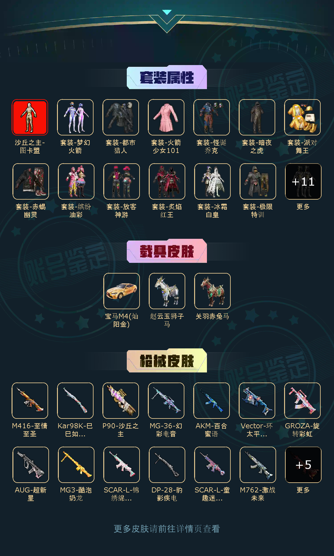19粉,3载具,166套装,17王牌印记,无敌战神历史最高段,88643热力值 平底锅-仲夏莫吉托/SCAR-L-童趣迷兔/M416-风花雪月/GROZA-旋转彩虹/M762-激战未来/SCAR-L-锦绣绵绵/AKM-百合蜜语/M416-至情至圣/AUG-超新星/MG3-酷泡奶龙/DP-28-圣堂之誓/MG-36-幻彩电音/DP-28-豹影疾电/Vector-环太平洋/P90-沙丘之主/破片手榴弹-秋玉花灯/Kar98K-巳巳如意/AMR-智耀战神/宝马M4(灿阳金)/关羽赤兔马/赵云玉狮子马/照夜玉狮子/
