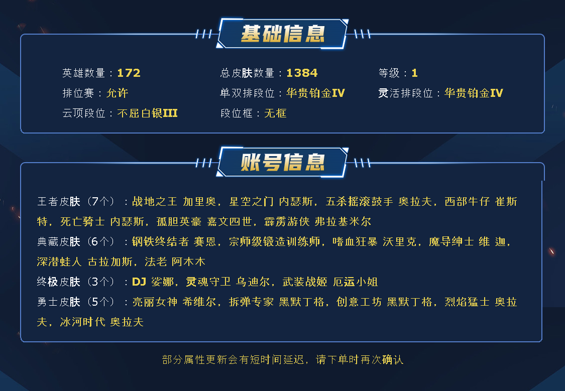 ~~喜欢记得收藏~~可排位~~1400皮全英雄~~租之前尽量查一下游戏ID,确保段位是您需要的,避免浪费您的时间~~请勿挂机逃跑故意送人头,谢谢合作,谢谢~~
