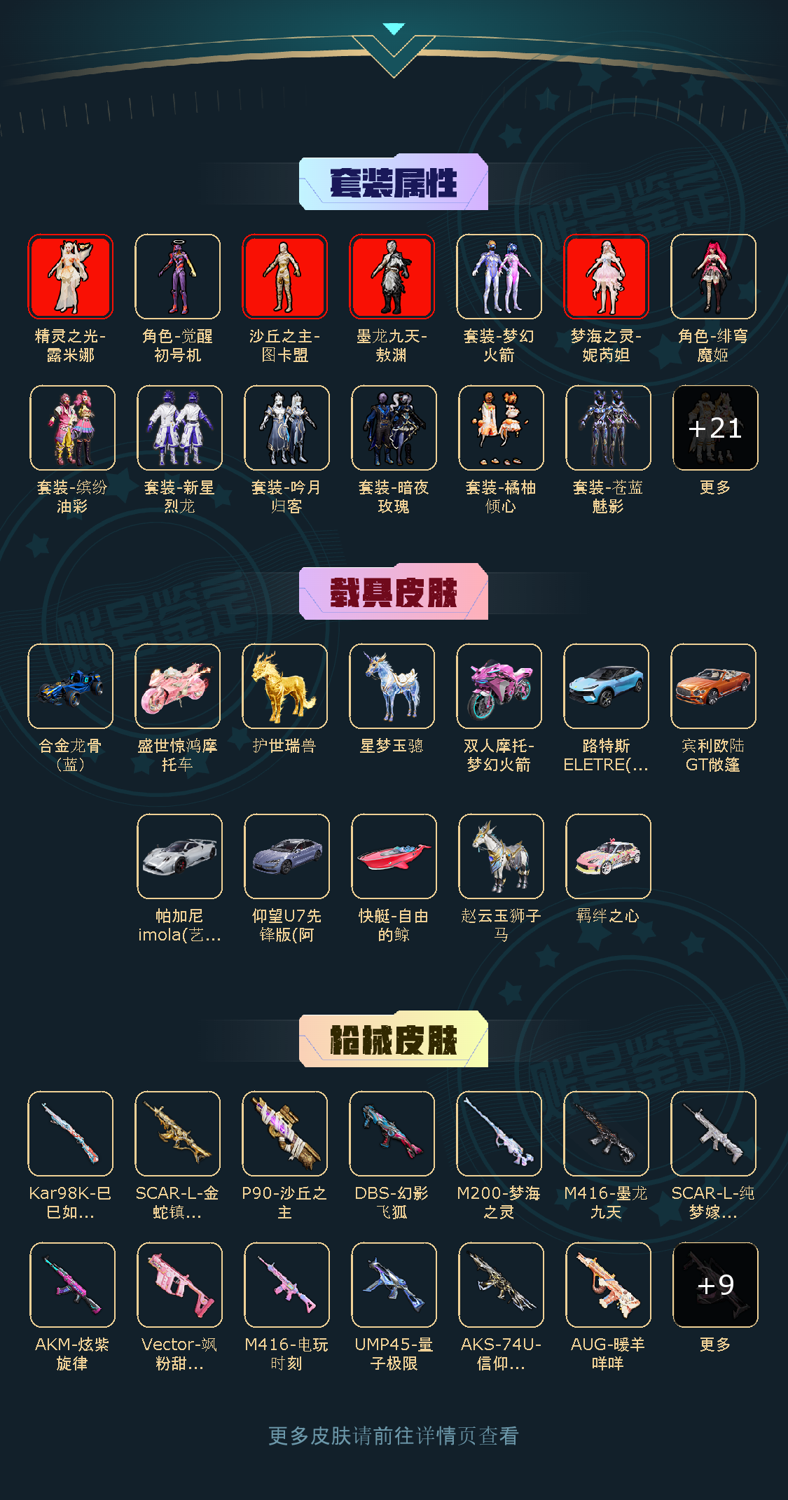 34粉,12载具,23特效枪,258套装,11王牌印记 M416-心之恋语/平底锅-林间仙鹿/AKM-炫紫旋律/路特斯ELETRE(冰川蓝)/快艇-自由的鲸/双人摩托-梦幻火箭/合金龙骨(蓝) 升级装 红装 素材号氪金号身法号 男女通用号女神号 沙丘之主图卡盟